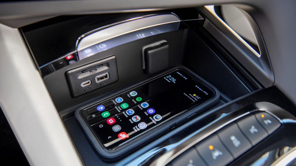 В салоне сохранены стрелочные спидометр и тахометр. 10,2-дюймовый экран мультимедийной системы аккуратно вписан в переднюю панель, а не торчит из неё в виде планшета. Кроме этого экрана ни одной сенсорной панели в Envision нет: блок климат-контроля кнопочный, равно как и селектор АКП. Между передними сиденьями установлен двустворчатый бокс-подлокотник, в который можно залезть, не беспокоя соседа. Лоток для смартфона с USB-разъёмами закрывается крышечкой. Система активного шумоподавления входит в стандартную комплектацию. Также в базу включены сразу девять электронных ассистентов водителя, в том числе система удержания в полосе, мониторинг слепых зон и система AEB (автоматического аварийного торможения) с функцией распознавания пешеходов.