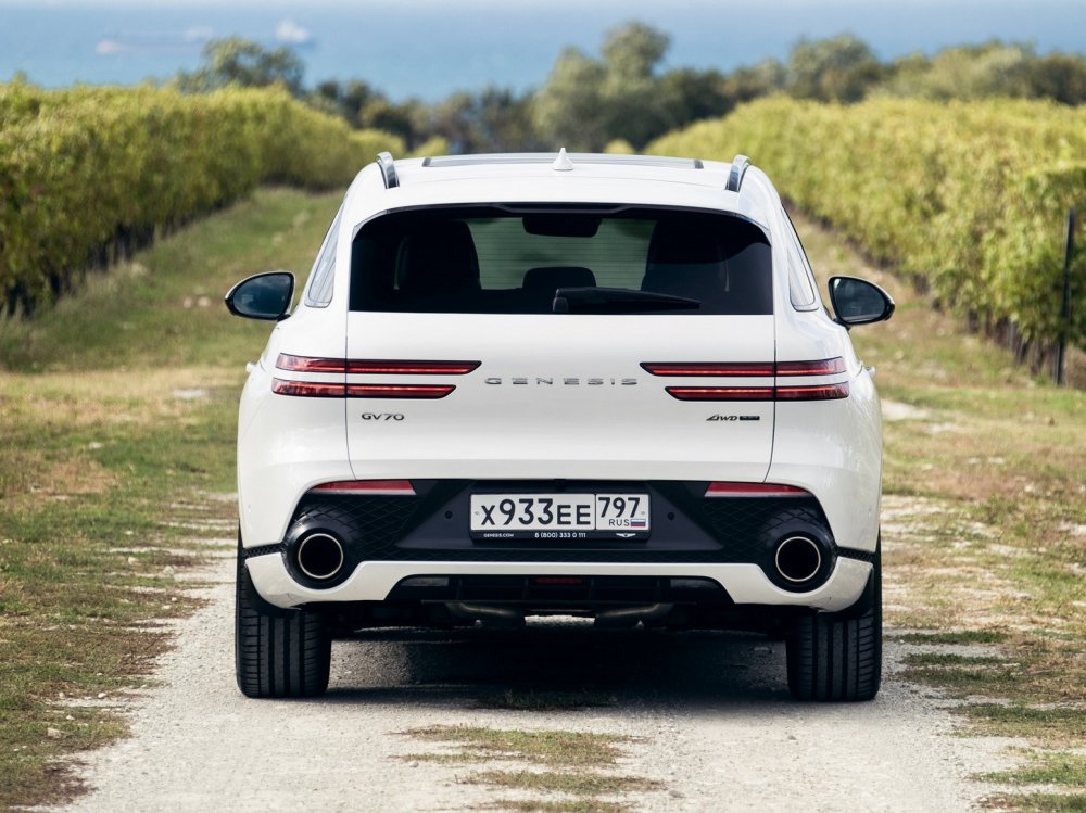 Похожая картина и с плавностью хода. На шоссе с хорошим асфальтом GV70 упруг и комфортен, но на городских выбоинах, люках, трещинах и лежачих полицейских подвеска пропускает жесткие удары. И это на базовых 19-дюймовых колесах! Понятно, что на опционных «катках» диаметром 21 дюйм будет еще хуже. А вот с шумоизоляцией порядок. Ни шины, ни ветер совершенно не раздражают.