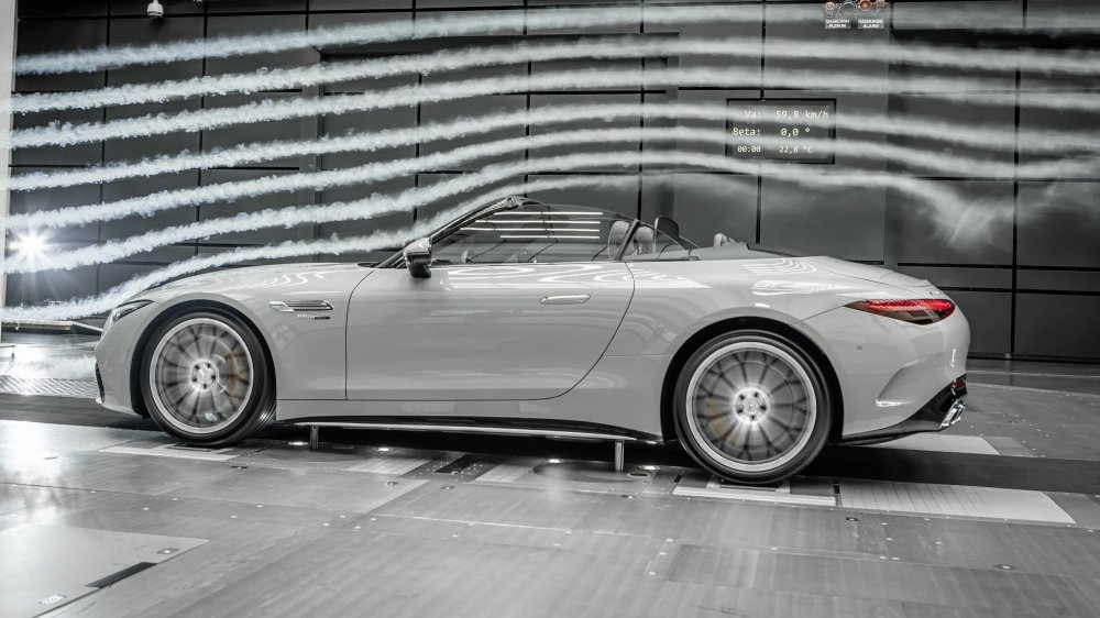 Даже со сложенной крышей кузов имеет приличные аэродинамические показатели:сх = 0,31, но это с дефолтным, то есть закрытым положением активных аэродинамических элементов — направляющих заслонок в переднем бампере и днище, а также спойлера в крышке багажника (выдвигается на скорости свыше 80 км/ч и имеет пять положений, которые выбираются автоматически электроникой).