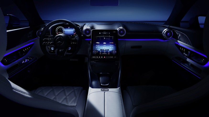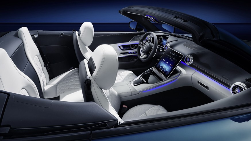 Интерьер Mercedes-AMG SL нового поколения рассекретили ещё минувшим летом. В компании его назвали «гипераналоговым» (hyperanalog). В салоне присутствуют круглые дефлекторы вентиляции: на передней панели расположены четыре «турбины». Кроме того, стоит обратить внимание на виртуальную «приборку» диагональю 12,3 дюйма, которая визуально как будто утоплена в нишу. Вероятно, таким образом в компании решили сделать так, чтобы при езде с открытым верхом было видно дисплей, а не блики на нём.