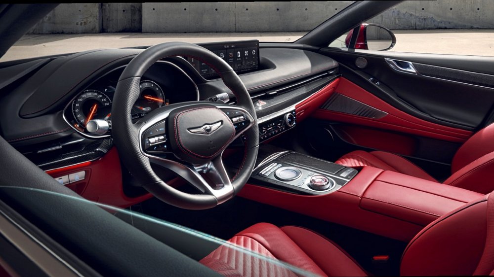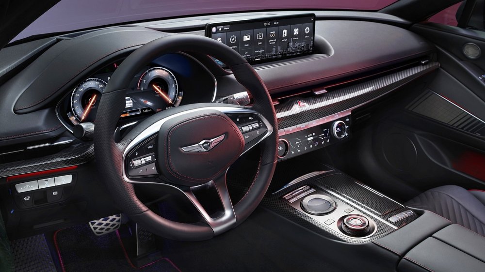 Оказалось, что линейка двигателей у G80 Sport стандартная, то есть топовый мотор V6 T-GDI по-прежнему выдаёт 380 л.с. Два других двигателя, бензиновый 2,5-литровый мощность 304 л.с. и дизельный 2,2-литровый мощностью 210 л.с., для спортивной версии тоже доступны, но в сочетании с ними спорт-пакет — это чистой воды косметика: более агрессивный дизайн бамперов и порогов, тёмный хром вместо светлого, чёрные рамки фар, особый дизайн колёс, а в салоне — трёхспицевый руль вместо четырёхспицевого, отделка под карбон и серебристые накладки на педалях.
