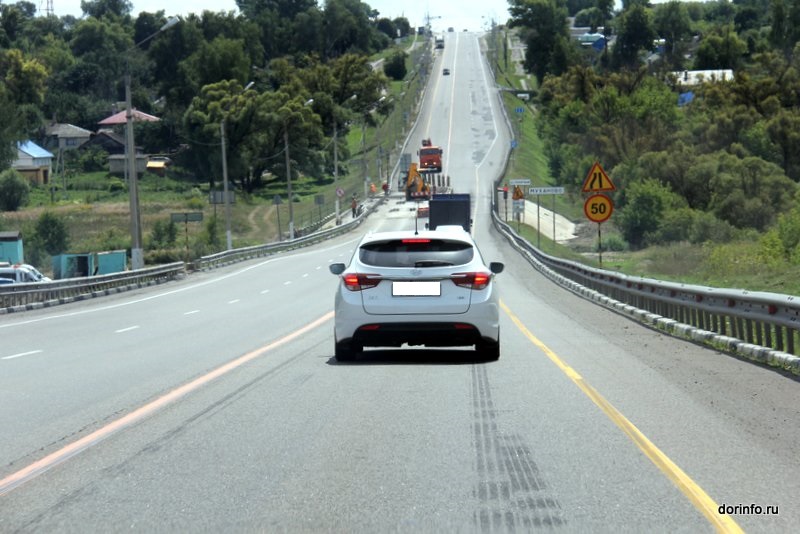 На 304-м км трассы мы въезжаем в Орловскую область. Особых изменений со сменой региона экипаж «ДорИнфо» не заметил. На 329-м км в районе поворота на Головлево и моста через реку Кола идут работы по устройству слоев. А сразу после этого участка мы движемся по обновленному отрезку без дорожной разметки.