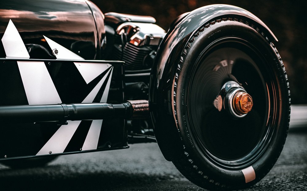 Morgan 3 Wheeler получил дизайн в лучших довоенных традициях: узкие спицованные колёса, подвеска и мотор напоказ, фары в отдельных корпусах, массивная система выпуска по бортам, тесный двухместный кокпит, дистрофические козырьки вместо полноценного ветрового стекла. Контракт на поставку двигателей был заключён с американской фирмой S&S Cycle: её 2,0-литровый солидно булькающий V-twin выдаёт максимальные 83 л.с. и 140 Нм, а в качестве коробки передач используется 5-ступенчатая «механика» от Mazda. До 100 км/ч трицикл массой 525 кг разгоняется за 6 с, максимальная скорость — 185 км/ч.