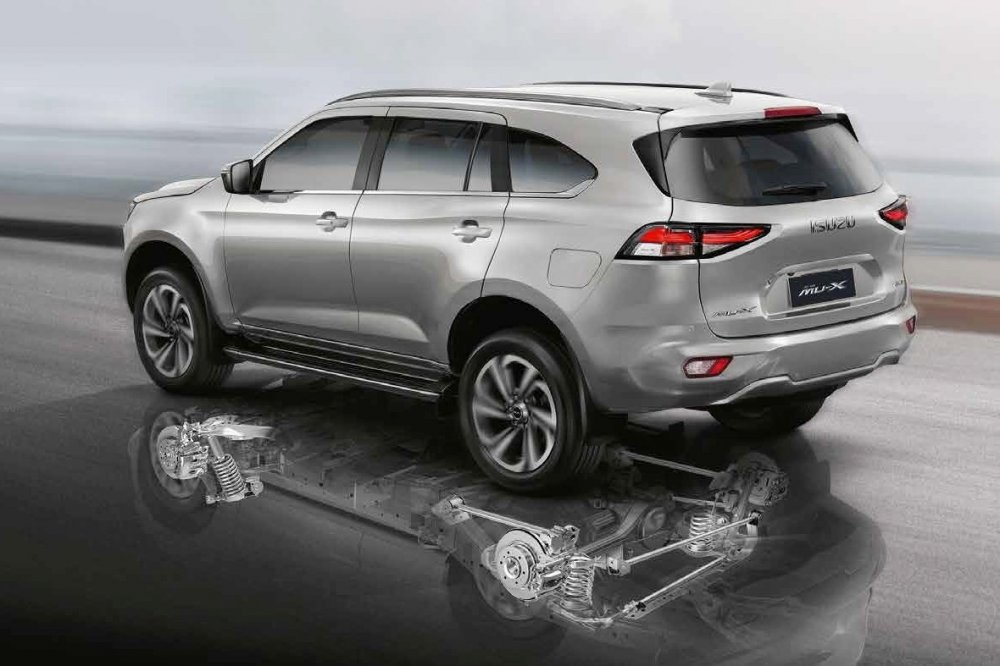 Вопреки ожиданиям, посеянным австралийскими СМИ, новый Isuzu MU-X не получил независимую заднюю подвеску: неразрезной мост остался, но кинематика 5-рычажной задней подвески всё-таки пересмотрена, а вместо исходных рессор установлены пружины. Это позволило существенно улучшить плавность хода по сравнению с пикапом, что особенно важно с учётом наличия в багажнике третьего ряда кресел. Габаритная длина нового Isuzu MU-X — 4850 мм, колёсная база — 2855 мм. Заявленный дорожный просвет у базовой заднеприводной версии — 230 мм, у полноприводной — 235 мм. Снаряженная масса — от 1950 до 2165 кг в зависимости от исполнения.