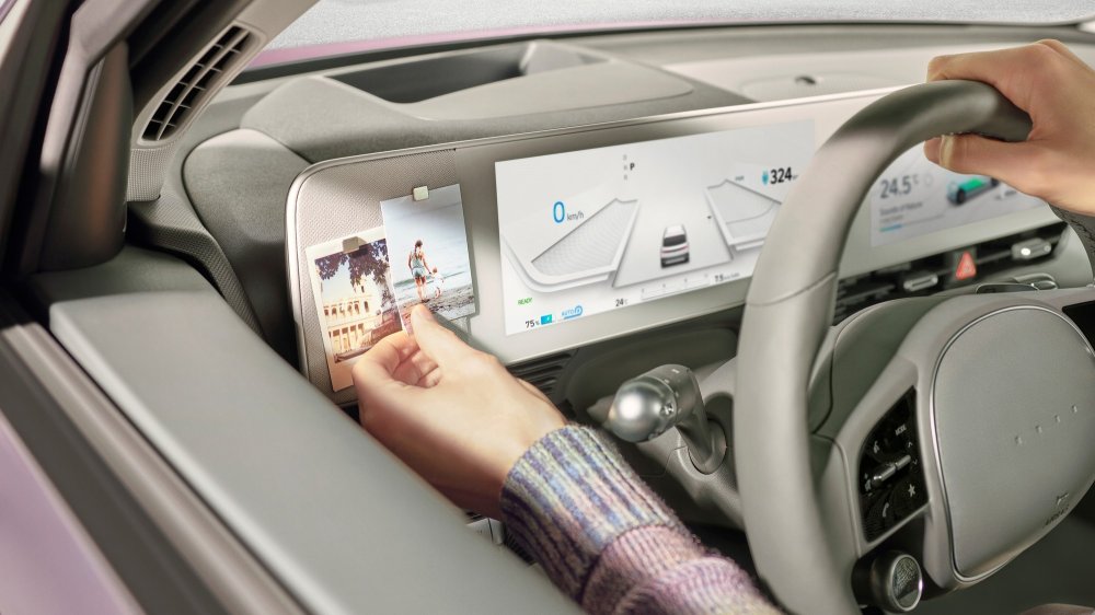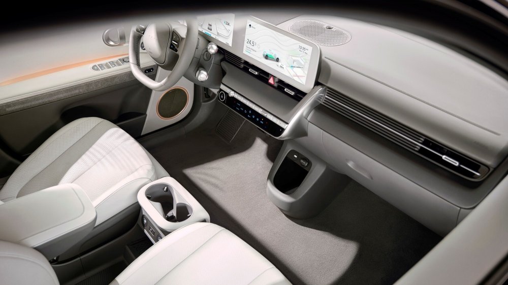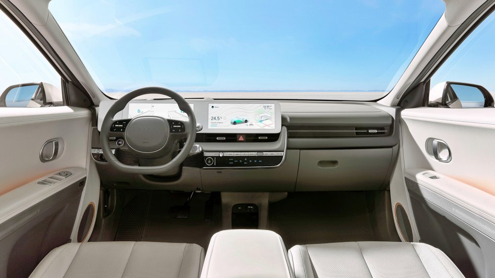 Приборная панель компактная и практически полностью сенсорная, хотя над блоком микроклимата есть ряд физических горячих клавиш. За визуальную информацию отвечают два 12-дюймовых экрана и проекционный дисплей дополненной реальности. Двухспицевое рулевое колесо снабжено обогревом. Выбор режимов движения возложен на один из правых подрулевых рычажков. Под передней панелью по центру есть небольшая вещевая ниша с розетками. В виде опции предлагается встроенная в крышу солнечная панель, которая позволит немного подзарядить батарею в светлое время суток.