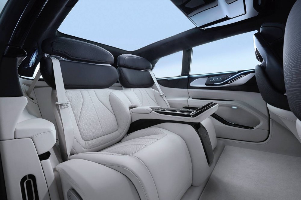 Колёсная база в 3200 мм позволила максимально просторно разместить в салоне четыре индивидуальных кресла, причём главные – задние: они снабжены электрорегулировками в 14 направлениях, плюс отдельные 4 для поясничного подпора. Спинки могут наклоняться аж на 60 градусов, что позволит с комфортом вздремнуть в дороге. Набивка с так называемой нулевой гравитацией, позаимствованной у специалистов NASA, обеспечивает оптимальное распределение нагрузок; в неё же встроены системы обогрева, массажа и вентиляции, а для полного расслабления искусственный интеллект, следящий за состоянием каждого пассажира, в режиме Spa Mode будет подбирать подходящую музыку и освещение. Передние кресла на вид не хуже, но, видимо, с упрощённым функционалом.