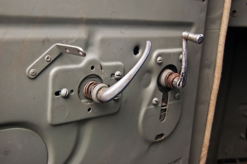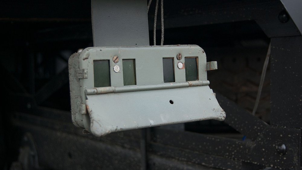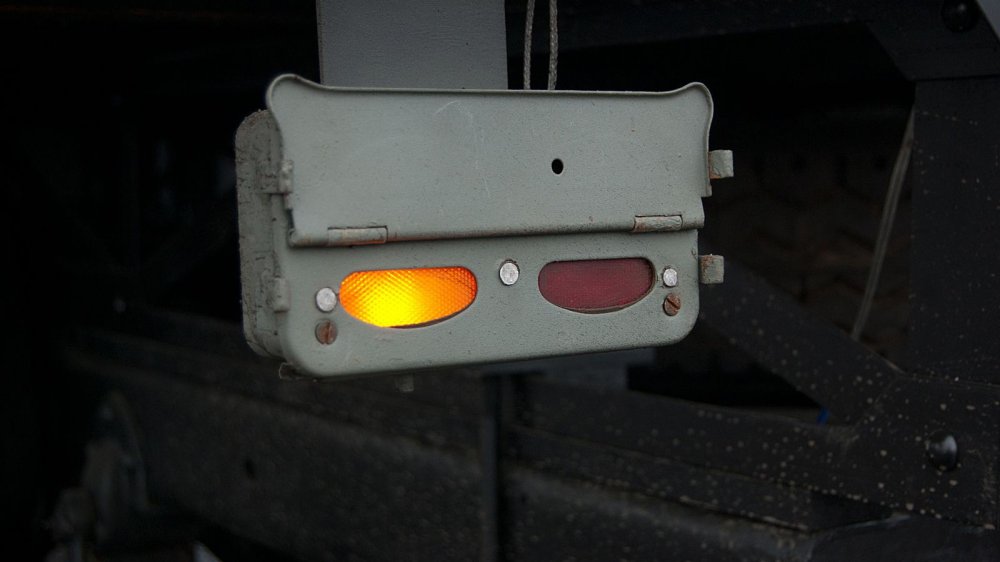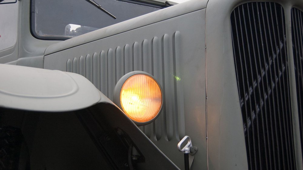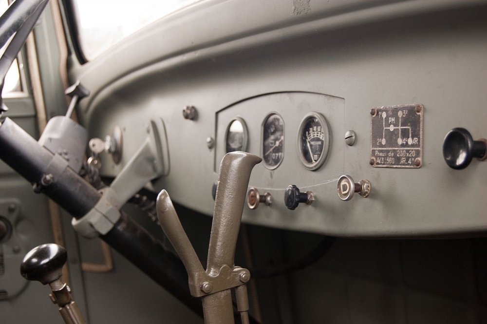 И, наконец, последнее – светотехника. Во-первых, пусть вас не удивляет жёлтый свет фар: такие во Франции были правила, тут всё «по заводу». Во-вторых, именно светотехника позволяет нам уверенно сказать, что машина всё-таки послужила немцам. Первая характерная деталь – прожектор слева на бампере. На гражданские машины их не ставили. Вторая – перекидные задние фонари. Подвижный щиток переводит их из гражданского режима (габаритные огни и стоп-сигналы) в «военное положение», при котором видны лишь лампочки для передвижения в колонне. Перекидные фонари – типично немецкая штуковина.