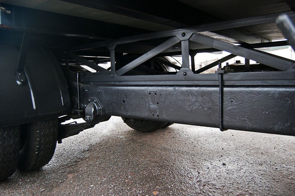 Профиль, конечно, вызывает уважение. На такой раме можно было бы построить тепловоз, но получился грузовик. Но самое интересное в ней – не монументальность, а очень сильные изгибы над задним мостом. Да, для легковушек это дело привычное, но не для грузовиков. Где суровая прямота наших ЗИСов? У французов такой прямоты нет. Задний мост получился сильно утопленным в раму, отчего сама машина стала сантиметров на 20-30 ниже других грузовиков этого класса времён Второй мировой. С одной стороны, это хорошо для центра тяжести, но для грузовика важнее существенное снижение погрузочной высоты. Так что такая рама – это очень здорово. Но ведра чудесных лягушек хватило на большее, и рама – это ещё не всё хорошее.