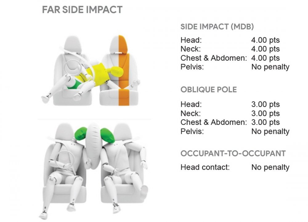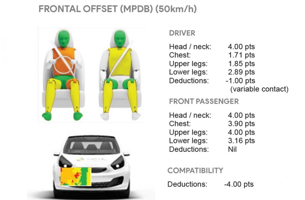 Но самое неприятное, что D-Max оштрафовали на 4 балла из 8 возможных за слишком суровое воздействие на встречную тележку массой 1400 кг с установленным на неё деформируемым барьером — эксперты отметили, что передняя часть пикапа представляет большую опасность для обитателей машин, с которыми он может столкнуться. Таким образом итоговая оценка за встречку у тяжёлого пикапа D-Max меньше чем у лёгкого хэтчбека Yaris (3,23 и 4,28 соответственно), при том что водитель и передний пассажир в Ярисе рискуют здоровьем гораздо больше (водитель, в частности, может потерять ступни).