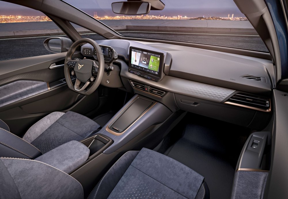 Интерьер el-Born принципиально ничем от такового у ID.3 не отличается, но передняя панель и дефлекторы системы вентиляции имеют иную, более замысловатую форму. За цифровым щитком приборов и мультимедийным экраном у испанской модели появился пластиковый нарост, создающий эффект кокпита. Вдобавок у el-Born более нарядные текстуры, собственный дизайн кресел, дверных карт и центрального тоннеля. Последний расположен чуть выше, чем у ID.3, и накрыт единой сдвижной шторкой, под которой, скорее всего, прячутся подстаканники.