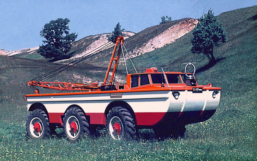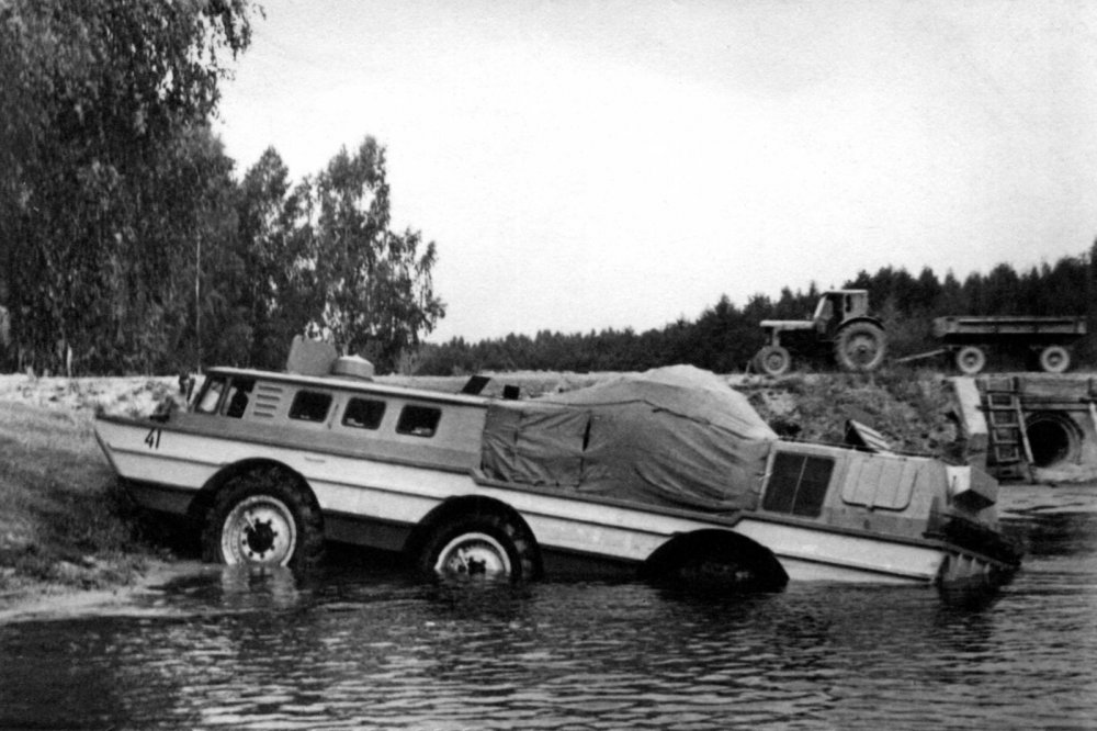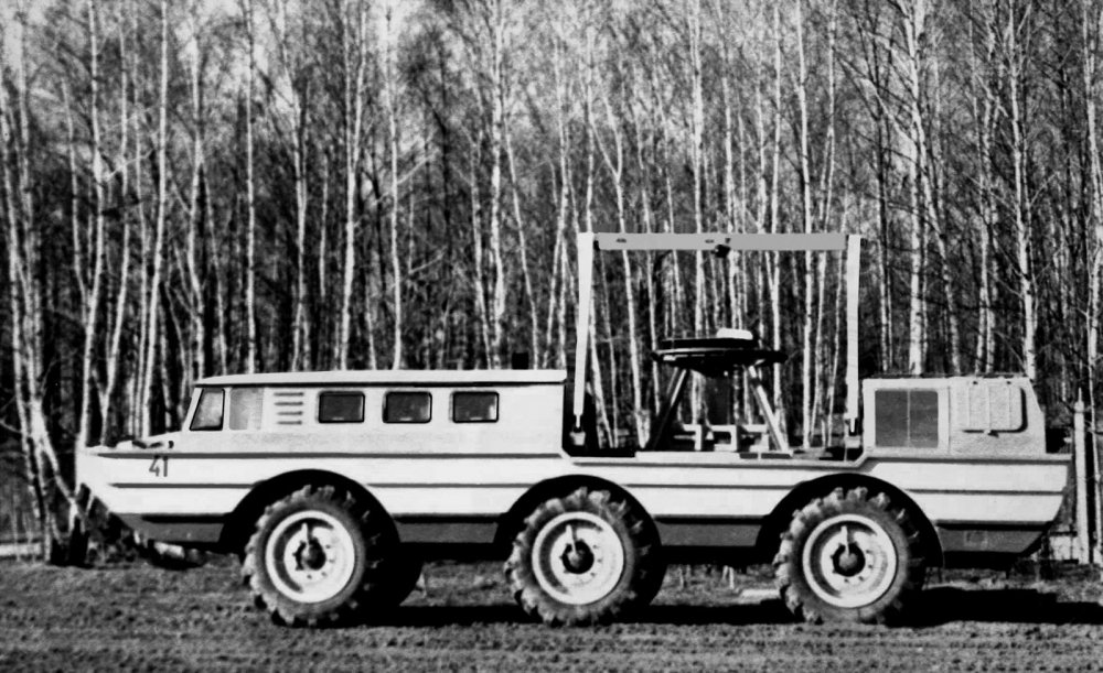 Чтобы все это хозяйство разместить на шасси, да еще сделать его плавающим, пришлось укрупнить и утяжелить вездеход, что требовало увеличения мощности мотора. Этого же требовали и широкие условия предполагаемой эксплуатации: машина должна была ездить по пескам и по снежной целине, желательно с высокими скоростями.