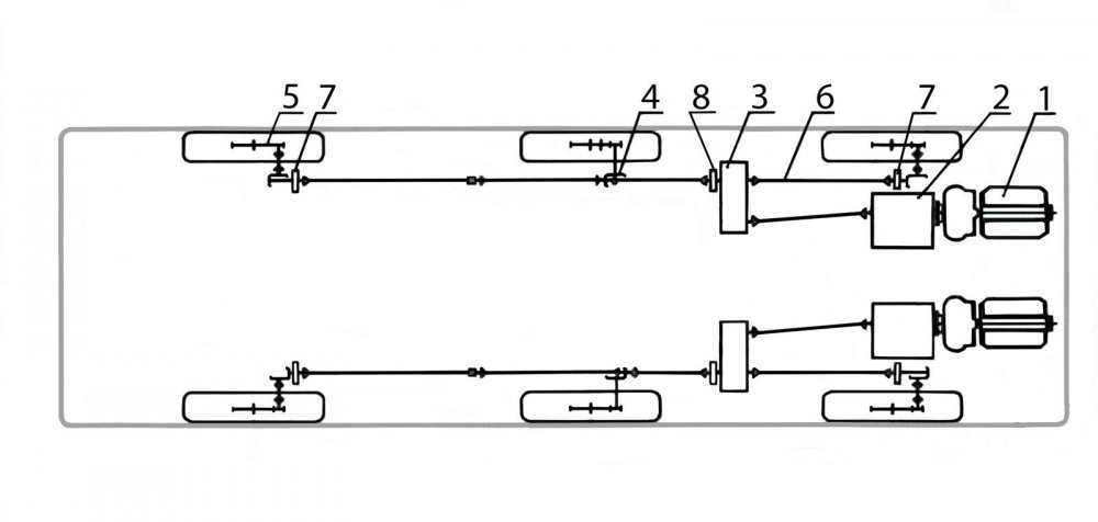 Давайте на минуту остановимся. Подкованный читатель наверняка задаст вопрос: как же обошлись без дифференциалов, ведь если на современной легковушке – что с задним приводом, что с передним – убрать межколёсный дифференциал, в повороте возникнет кинематическое рассогласование, поскольку колёса не смогут вращаться с разной скоростью. Совершенно верно. Дифференциал нужен в первую очередь в повороте, а нужен ли он при бортовой схеме? Переднее и заднее колесо в вираже поворачиваются в разные стороны, но на один угол – это значит, что при жёсткой связи их путь в вираже будет одинаковым при одинаковом давлении в шинах. Путь среднего колеса будет отличаться но не намного. Поскольку машину планировали использовать не на асфальте, а на песке, в снегу, в полях и степях, этой разницей вполне можно пренебречь.