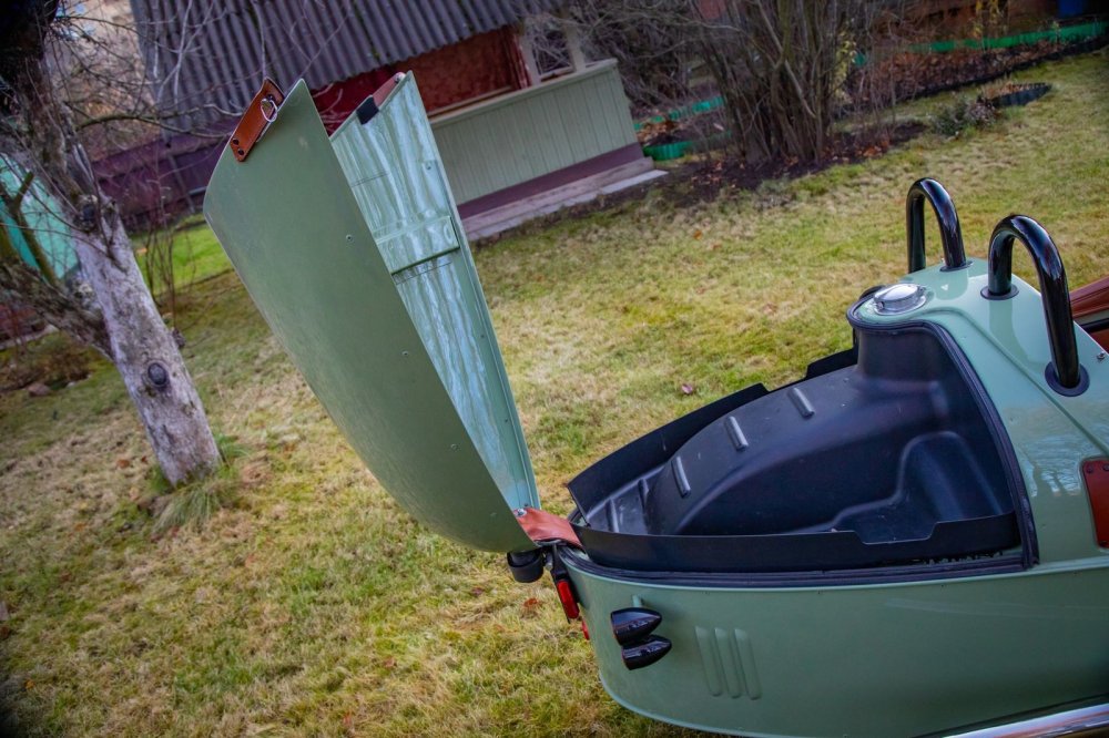 Забраться в «тривиллер» непросто: дверей нет, «ячейки» для водителя и пассажира узкие и тесные, а водителю еще и мешает руль. Впрочем, руль тут быстросъемный, отщелкивающийся по нажатию кольца-фиксатора и сдергивающийся по шлицам. Снял, залез, поставил – типовая процедура, как застегнуть ремень.