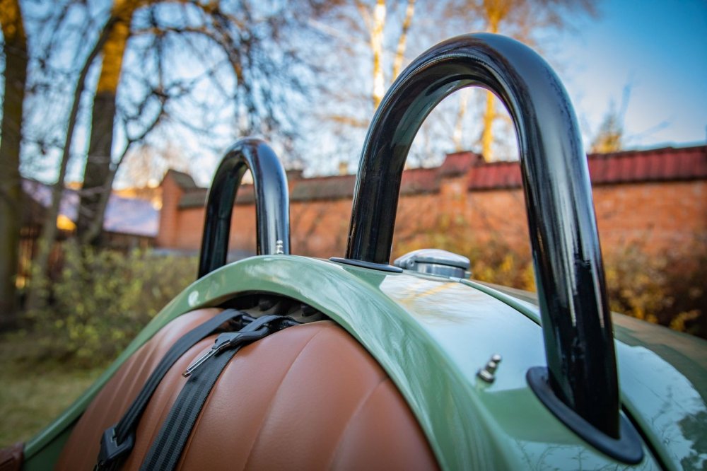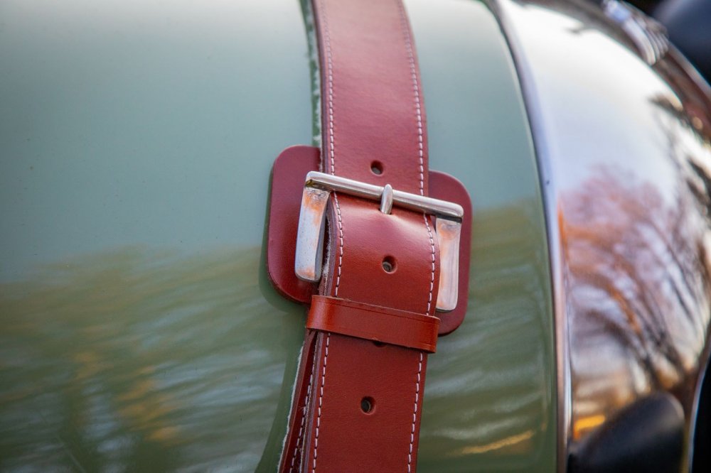 Кожаный ремень, перехватывающий крышку капота – декоративный. Удерживающими свойствами он не обладает. А чтобы не царапалась краска от микровибраций ремня в движении, его нижняя сторона выполнена мягкой, ворсистой.