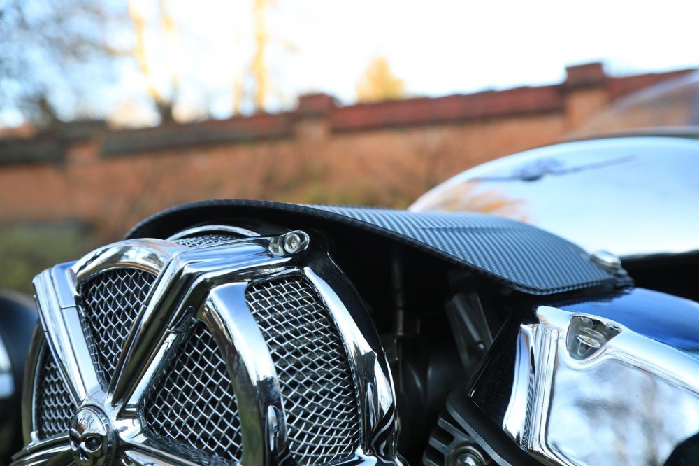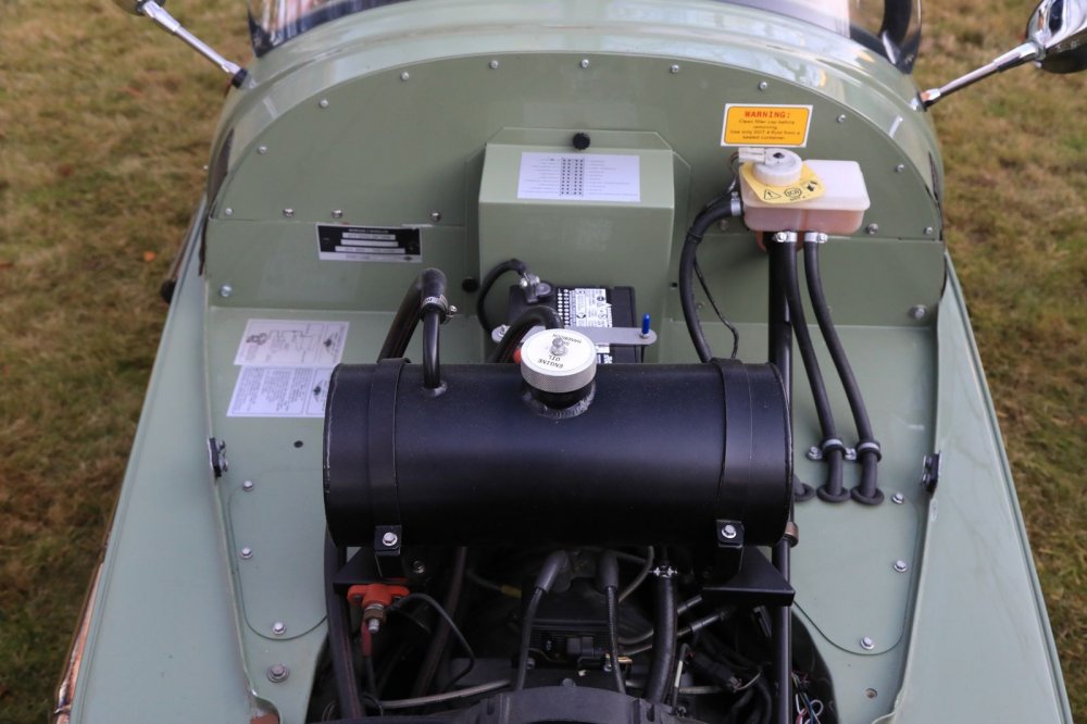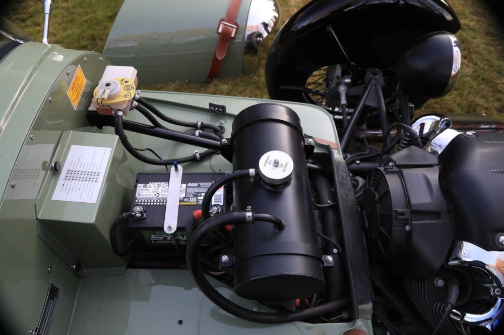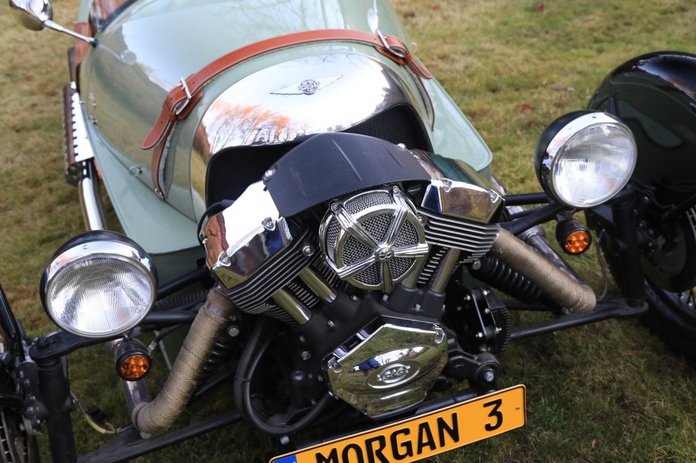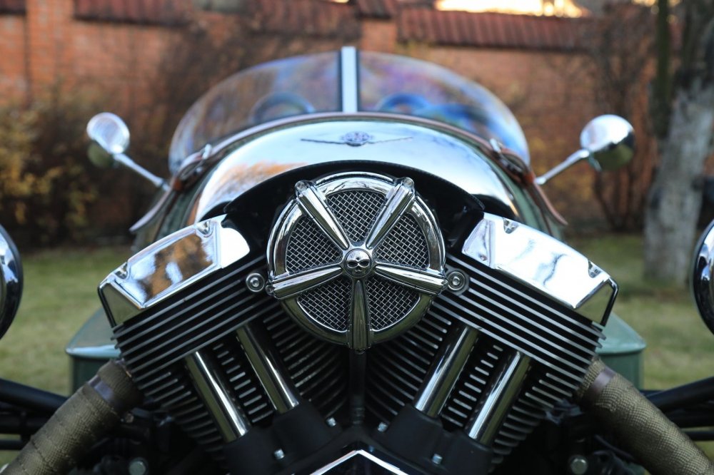 Двигатель тут, как ни странно, не карбюраторный, а инжекторный! Это крупный низкооборотный (по мотомеркам) мотоциклетный мотор X-Wedge 2006 года от американской марки S&S. Объёмом 2 литра и мощностью 82 л.с., в конфигурации V-twin с двумя цилиндрами под углом 56 градусов. Несмотря на переднее открытое расположение двигателя воздушного охлаждения, горячему мотору на Morgan 3-wheeler естественного обдува обычно не хватает, и к работе по отводу тепла достаточно быстро подключается электровентилятор, стоящий позади головок блока цилиндров.