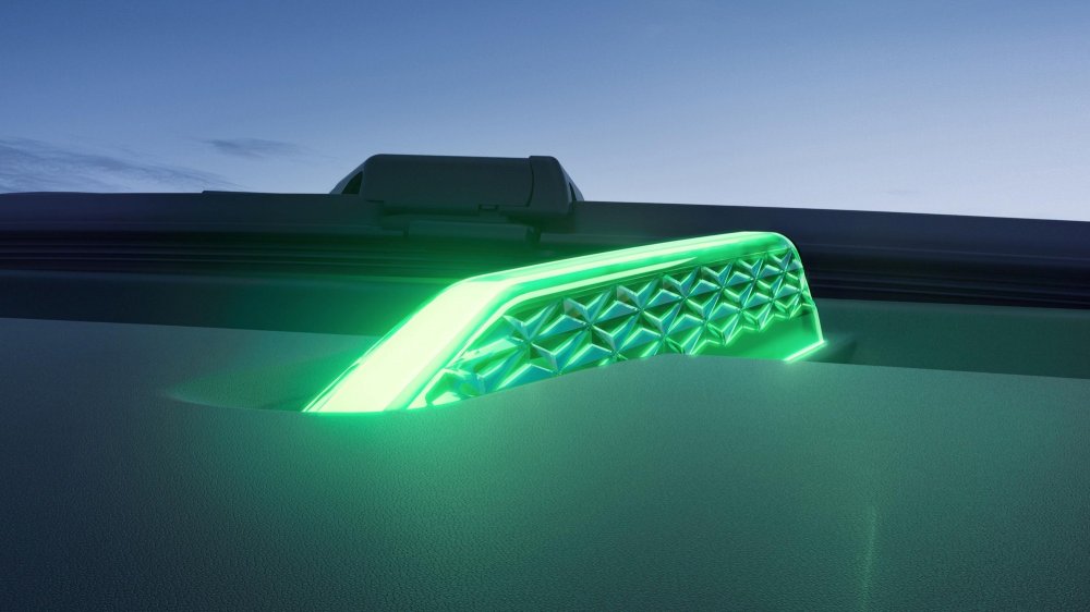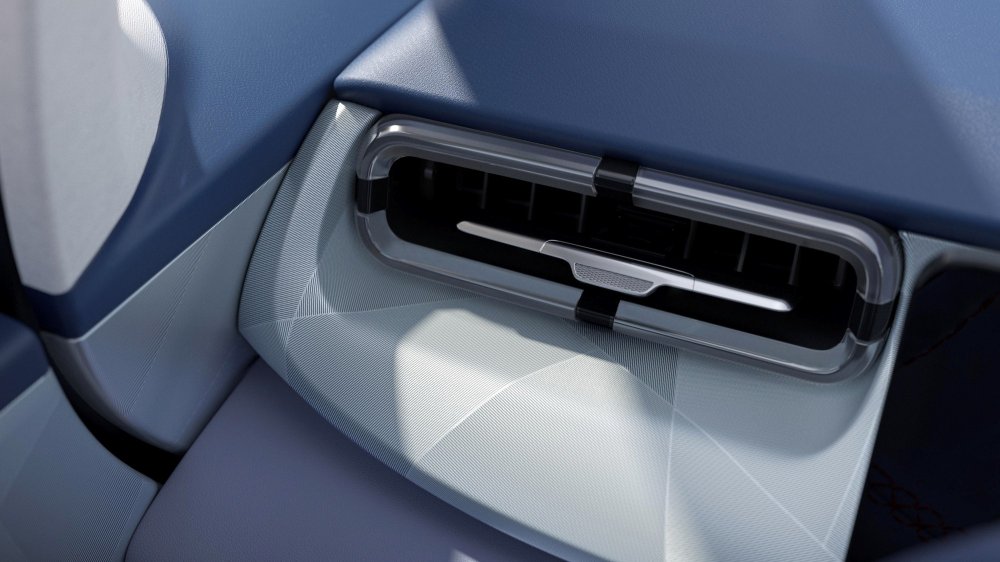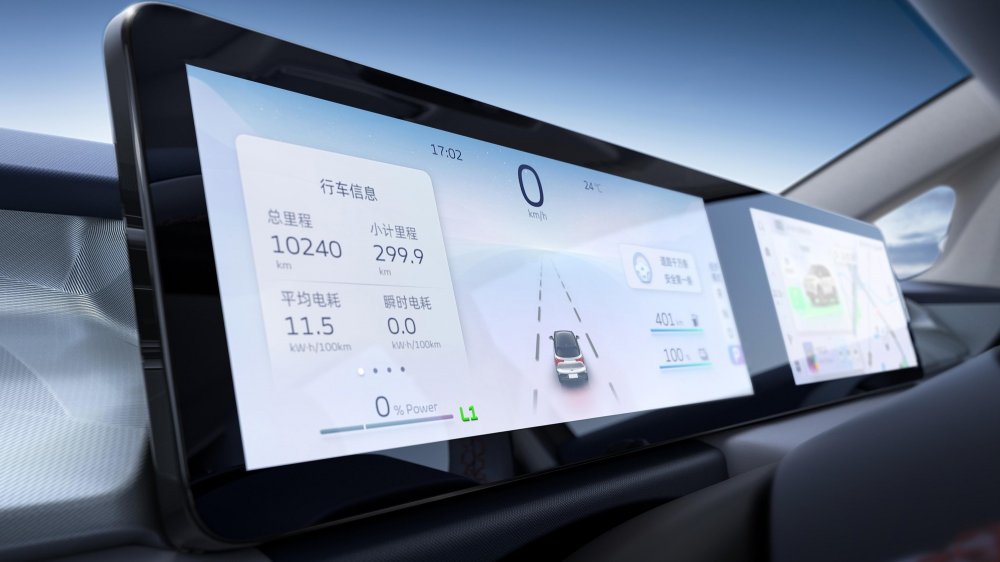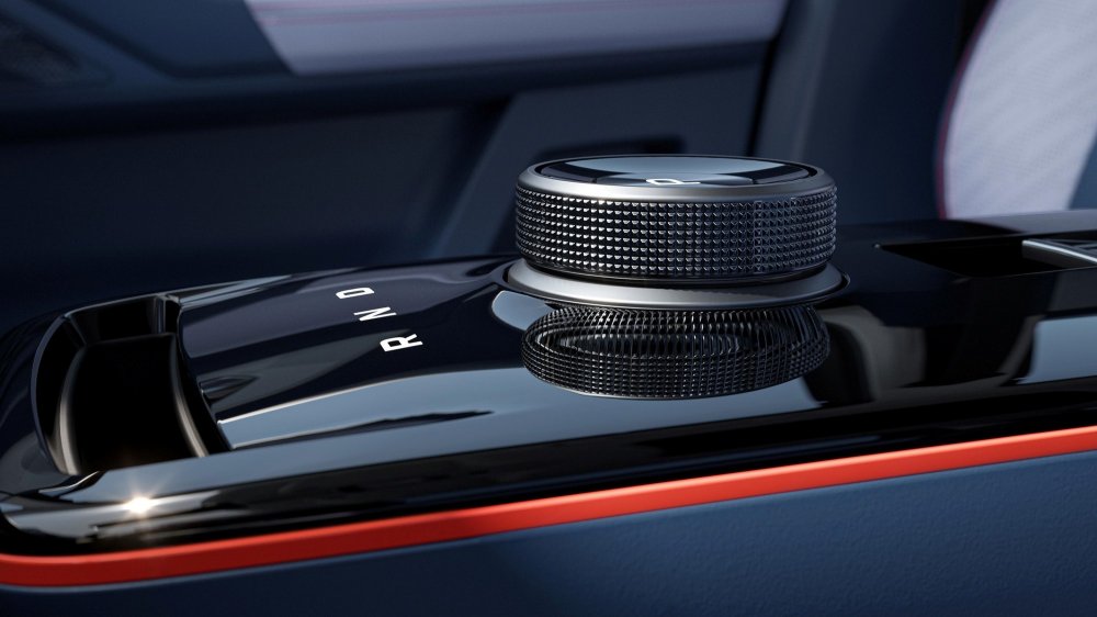 Двухэранное «табло» перед водителем состоит из двух секций по 10,25 дюйма, управление аудиосистемой и микроклиматом зашито в меню мультимедийной системы, отдельных физически клавиш для этого нет. Передняя панель имеет изящно оформленные возуховоды и подсвеченные диодами «грибки» аудиосистемы. В верхней части передней панели по центру находится многофункциональный светодиодный индикатор — он мигает при зарядке электромобиля, срабатывании замков и общении с голосовым помощником. Управление режимами силовой установки возложено на шайбу, расположенную на парящей консоли между передними креслами.