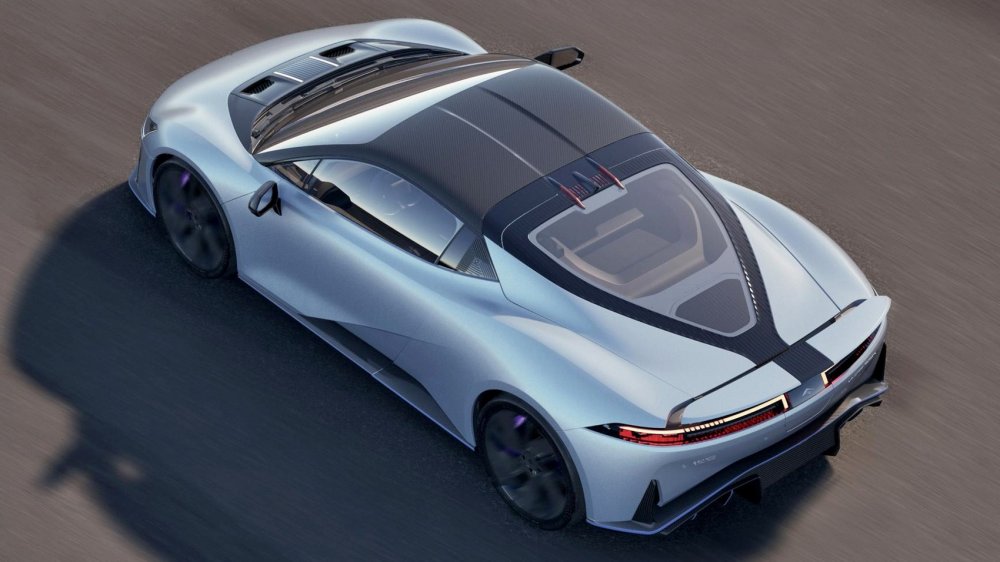 Кузов, судя по описанию на официальном сайте марки, целиком углепластиковый, в корму интегрировано поднимающееся на больших скоростях антикрыло, а в нижней части видим развитый диффузор. Двери с безрамочными стёклами — гильотинного типа. В салоне — два ковшеобразных кресла и лаконичная передняя панель с 8,8-дюймовым приборным экраном над рулём, как у современных автомобилей Peugeot, и 14,6-дюймовым мультимедийным планшетом по центру.