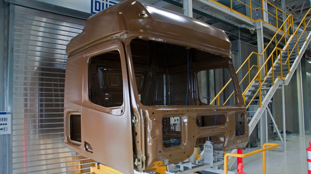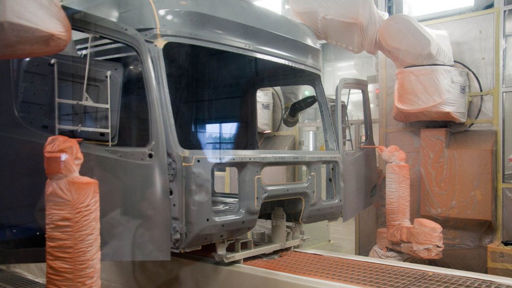 Кабины проходят целых 12 различных ванн — их отмывают и отправляют на электрокатофарез. Ну, это процедура стандартная, тут удивляться нечему. Как и тому, что после “купания” кабины отправляются в печь для сушки. Интересное начинается непосредственно в покраске. Тут не ждут, когда высохнет грунт (белый или серый в зависимости от будущего цвета кабины), а наносят краску сразу на мокрый грунт. Это и называется технологией “мокрым по мокрому”. Говорят, получается не только красиво, но и стойко к коррозии.