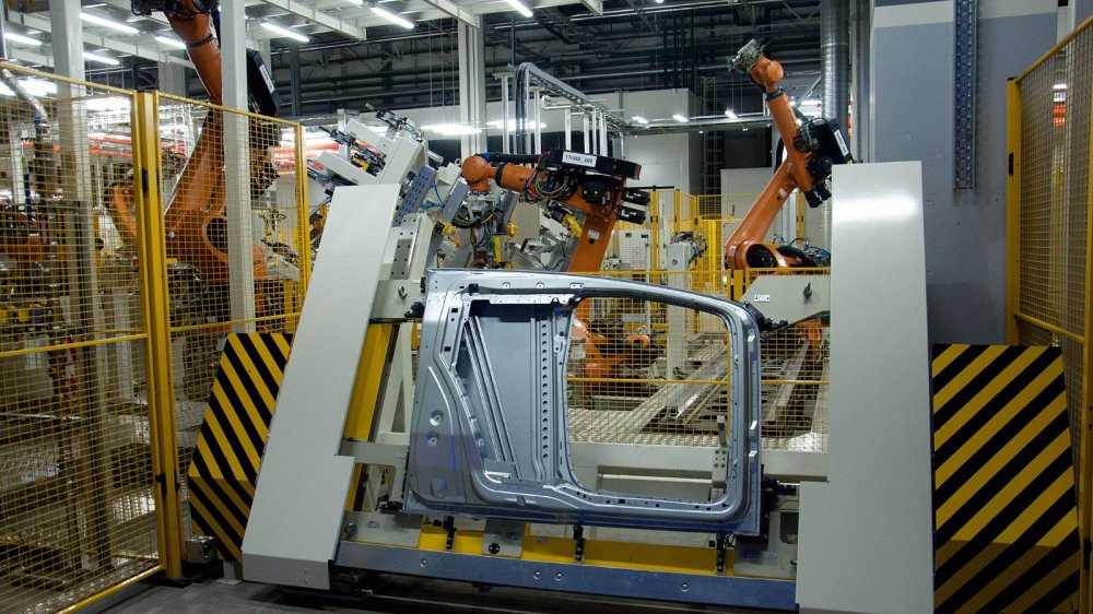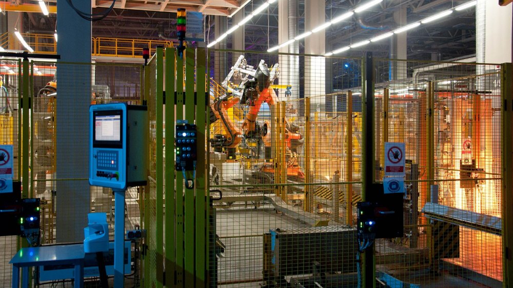 Цех, где варят кабины, называется кузовным (есть ещё цех окраски и логистический). Его архитектуру тут называют “рыбьим хребтом”: есть средняя линия, где идёт основная сборка, а от неё отходят “рёбра” линий подсборки. И на сборке мне показалось, что она вымерла: людей нет, темно… Оказывается, тут почти везде работают роботы. А свет им не нужен.