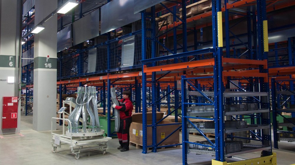 Остаётся посмотреть только цех логистики, но там, если честно, ничего нет. Очень узкие проходы для экономии места, по которым ездят штабелеры и тележки. Точность и скукота — больше сказать нечего.