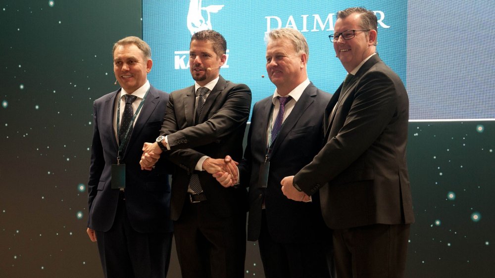 Сотрудничество КамАЗа и Daimler AG началось давно. Ещё в 2008 году немецкий концерн приобрёл 10% уставного капитала тогда ещё ОАО «КамАЗ» (сейчас это ПАО). С тех пор доля немцев в автогиганте сильно не повысилась и составляет всего 15%. Зато они получили множество приятных “плюшек” в виде сервисной сети КамАЗа. А других отечественных магистральных тягачей в России нет, так что ход Даймлера в этом отношении был очень хорош.