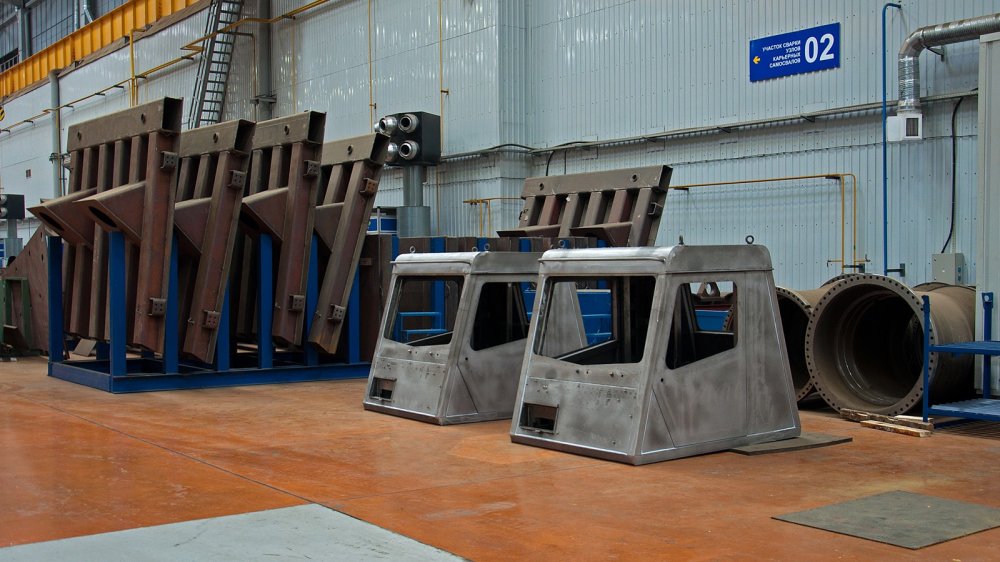 Из цеха сварных конструкций в ПСТМ поступают готовые сварные элементы рам, платформ, кабин и других конструкций, которые проходят крупноузловую сборку. Уже на стапеле раму сваривают окончательно (целиком её провезти по заводу просто невозможно). Затем на ней монтируют переднюю и заднюю подвески. После этого приходит время установки дизель-генератора. Кстати, двигатели, шкафы управления электромеханической трансмиссией (для сверхтяжёлых самосвалов), генераторы, электромоторы – всё это завод покупает у сторонних производителей, поэтому в сборку эти агрегаты приходят уже в собранном виде и после проверки на заводе-изготовителе.