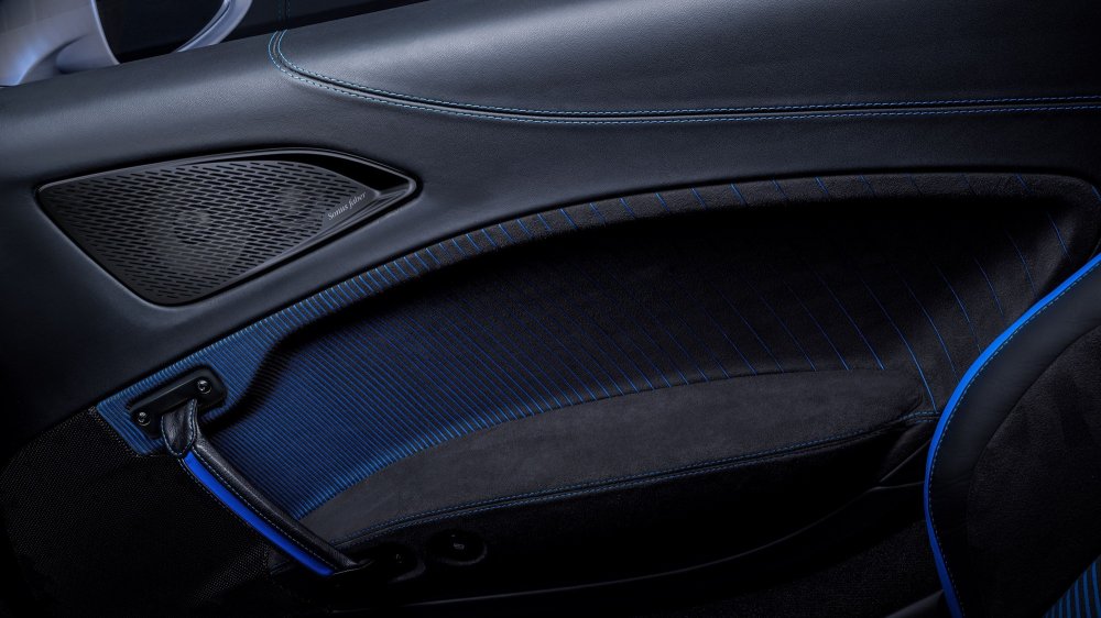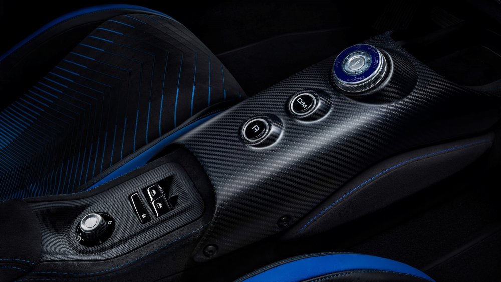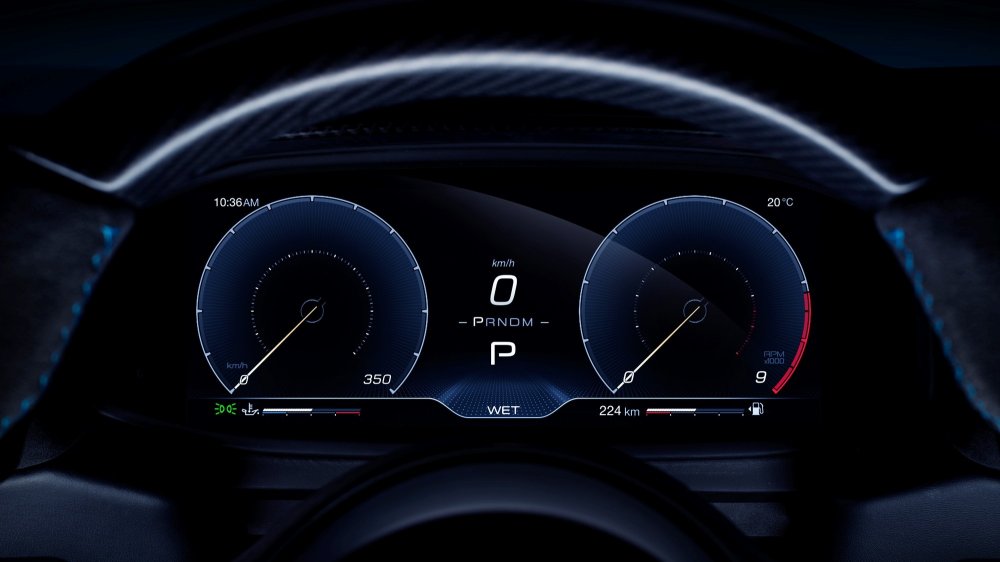 Интерьер минималистичный, но имеет щедрую отделку углепластиком и алькантарой. Щиток приборов полностью виртуальный, 10-дюймовый. Такая же диагональ у центрального планшета, отвечающего за мультимедийные функции и ездовые настройки автомобиля. На узком центральном тоннеле расположились рукоятка регулировки громкости, клавиши стеклоподъёмников, кнопки управления коробкой и шайба выбора ездовых режимов — GT (туристический), Wet (мокрый), Sport (спортивный), Corsa (трековый) и ESC Off (отключение противобуксовочной системы). Аудиосистема — от итальянской фирмы Sonus Faber. Для багажа предусмотрены две небольшие ёмкости в передней и задней частях кузова общей вместимостью 150 л.