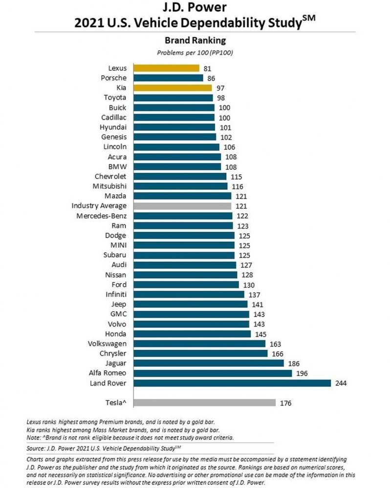 Слова Боллоре подтверждает последний рейтинг надёжности автомобилей американской компании J.D. Power, опубликованный в феврале. Он охватывает 80 тысяч американских владельцев автомобилей 3-летнего возраста (то есть купленных в 2018 году) и фиксирует количество неисправностей и проблем, с которыми столкнулись владельцы этих машин за последние 12 месяцев. Марка Land Rover занял в этом рейтинге последнее место: 244 проблемы на 100 автомобилей. Jaguar занял третью строчку с конца: 186 проблем на 100 автомобилей. Между ними вклинилась многострадальная Alfa Romeo с результатом 196 проблем на «сотню».