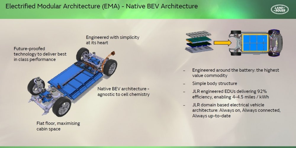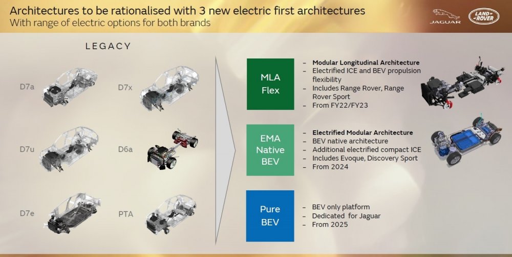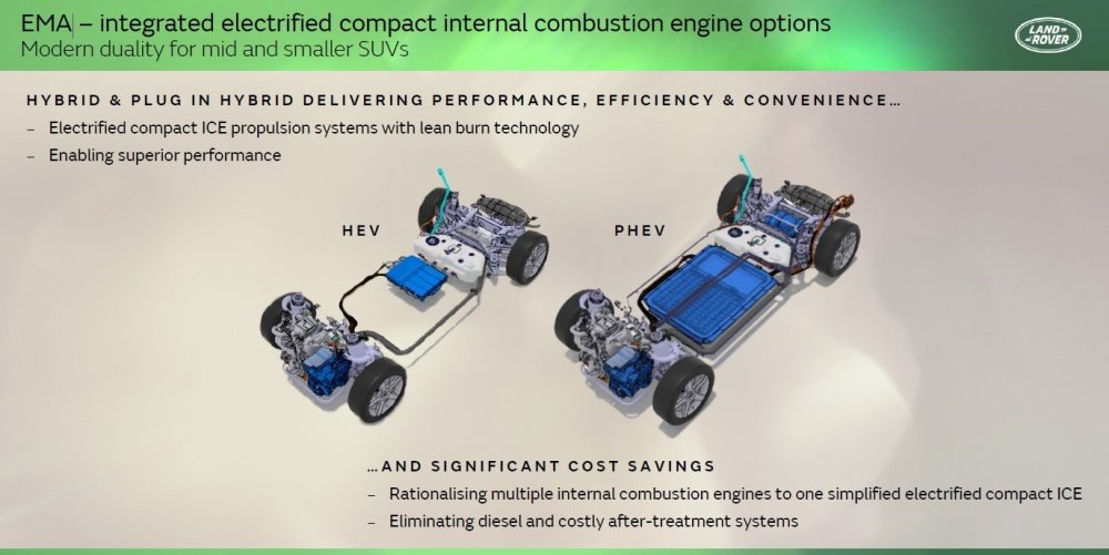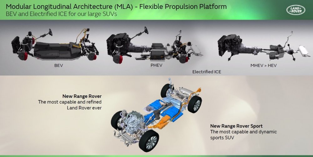 Крупные модели, такие как новые Range Rover и Range Rover Sport, будут построены на платформе MLA (Modular Longitudinal Architecture), которую отняли у Jaguar (для будущих машин этой марки будет разработана или куплена отдельная платформа), а компактные и среднеразмерные — на платформе EMA (Electrified Modular Architecture). Обе предполагают возможность выпуска как электрических, так и гибридных машин, в том числе без зарядки от внешнего источника, а главная разница состоит в том, что у EMA батарея плоская, а у MLA — «рельефная» и на электромобилях будет занимать место в том числе в центральном тоннеле. Вероятно, только так с нынешними батарейными технологиями инженерам Land Rover удалось обеспечить приемлемый баланс между величиной колёсной базы, проходимостью и ёмкостью батареи.