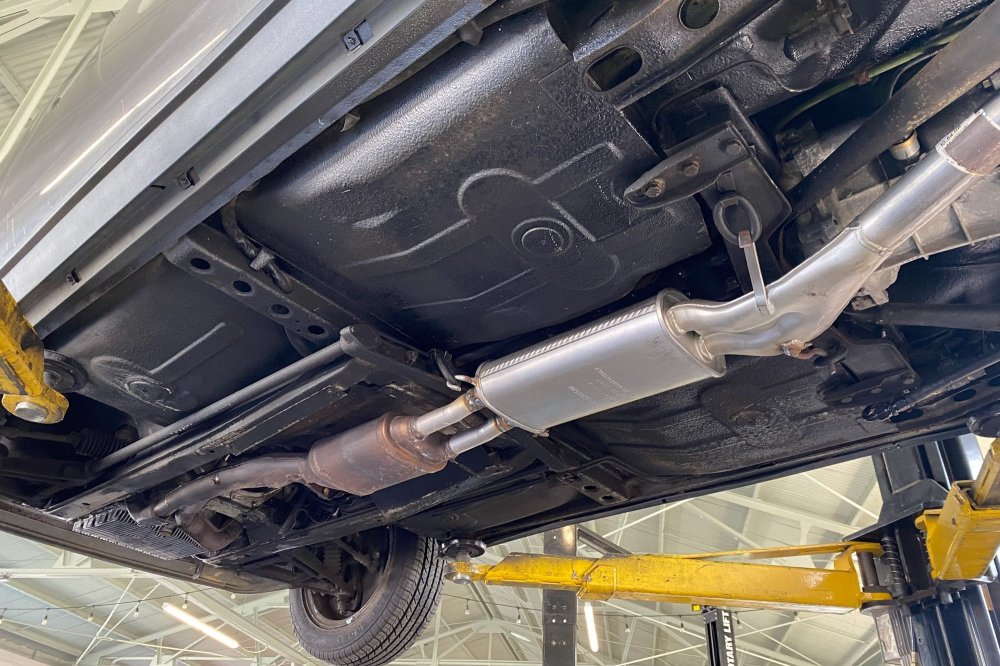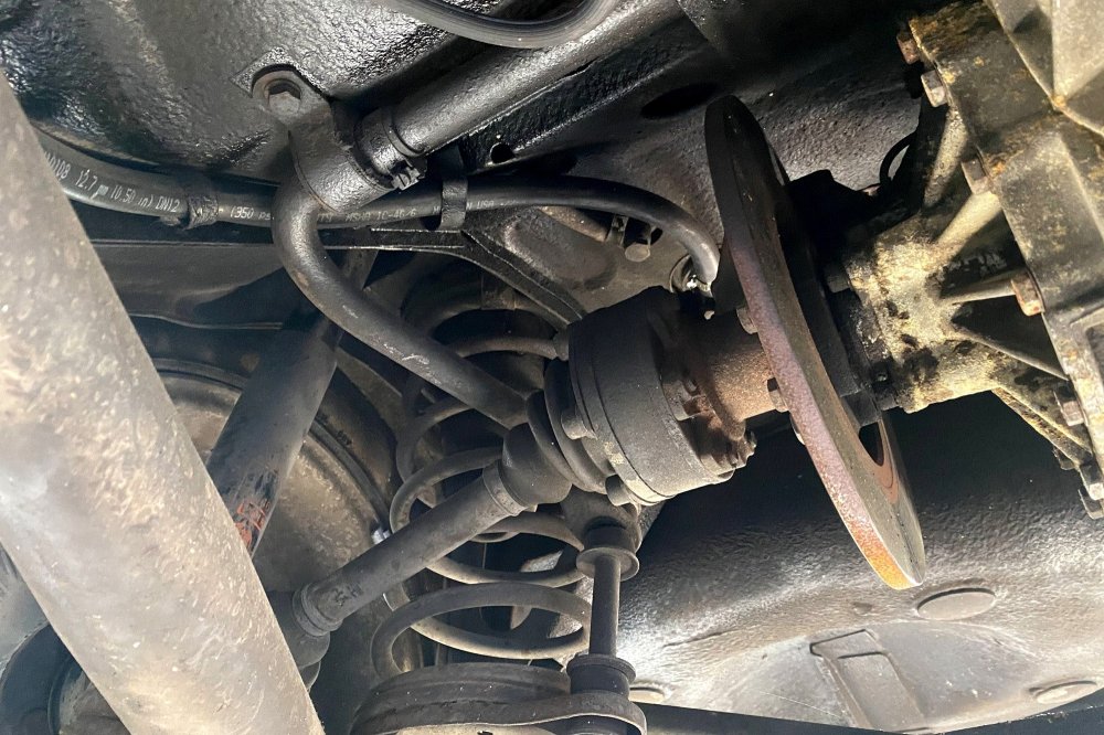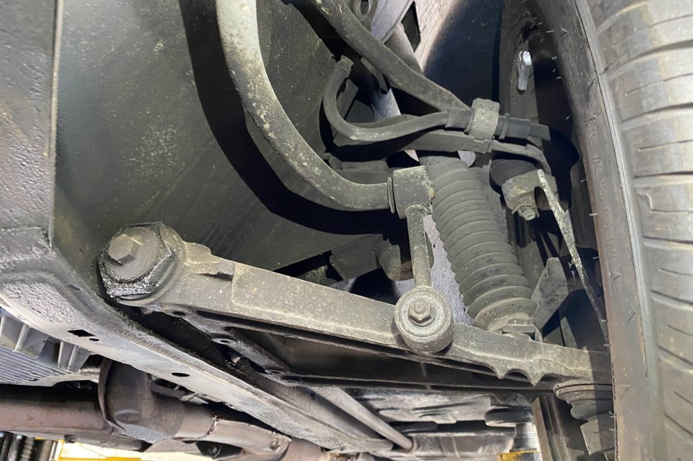 Подвеска сделана в прямом смысле с размахом: задняя с разнесёнными пружинами и амортизаторами, на длинных косых рычагах, тянущихся к подрамнику, установленному перед коробкой передач. Спереди – двухрычажная схема с длинным продольными торсионами. Нижние рычаги сдвоенные, к их основанию крепятся торсионы, а через широкие верхние рычаги пропущены стойки амортизаторов.