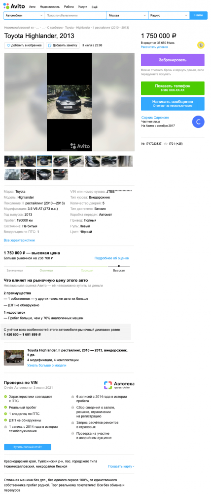 Итак, теперь нам стало понятно, что Highlander – это во многом родственник Camry, но с постоянным полным приводом, просторным салоном, тремя рядами сидений, «чересчур мощным» мотором и лишним весом. Ну а покупать такой кроссовер сегодня стоит с оглядкой на неизбежные возрастные особенности: состояние мотора, остаточный ресурс коробки передач и зарождающиеся кузовные проблемы. Однако в целом это будет вполне неплохое приобретение, особенно если найти автомобиль от первого владельца с пробегом до 200 тысяч километров и безаварийной историей. Конечно, таких машин крайне мало, но Автотека подсказывает, что шансы купить примерно вот такой автомобиль еще есть. Вопрос лишь в том, готовы ли вы заплатить за него, как за новый 8 лет назад в расчете на магию ликвидности Toyota при последующей продаже.