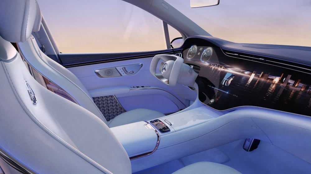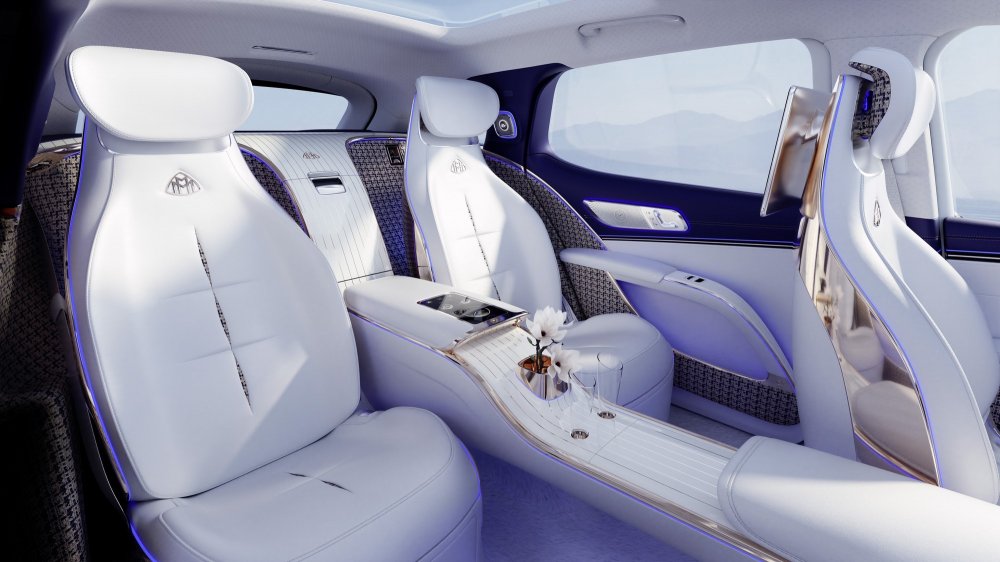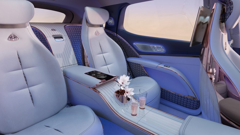 В салоне дизайнеры оказались заложниками высокотехнологичного 56-дюймового табло Hyperscreen во всю ширину передней панели — такого же, как у топовых версий лифтбека Mercedes-Benz EQS и седана Mercedes-Benz EQE. Это табло определяет форму воздуховодов и прилегающих к панели элементов — «парящий» центральный тоннель тоже, по сути, у всех трёх вышеозначенных новинок одинаковый, но только у Майбаха есть декор из «розового золота». Сплюснутый руль — особенность концепта, вряд ли Daimler рискнёт уподобиться Тесле и оставить такой на серийной машине, потому что с беспилотными технологиями немецкий концерн пока далеко не продвинулся. Четыре индивидуальных кресла в концепте кажутся слишком скульптурными, на серийной машине они наверняка будут более традиционными на вид.
