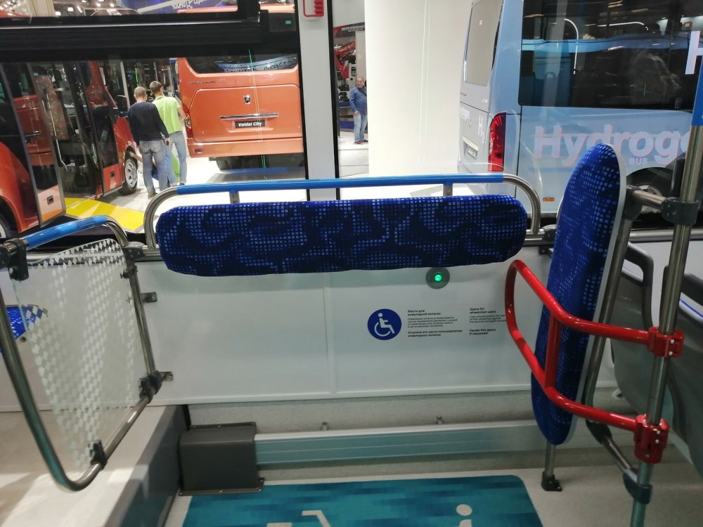 Довольно неожиданно для небольшого автобуса выглядит солидная накопительная площадка и даже пневматическая подвеска, которая обеспечивает дополнительное понижение пола до уровня бордюра. В общем, всё для людей.
