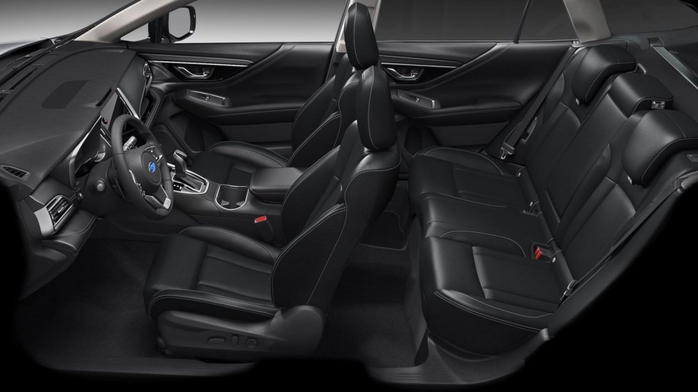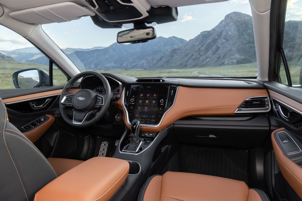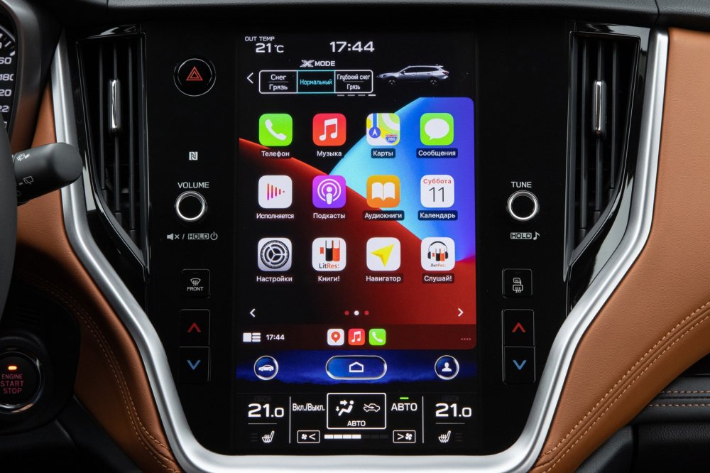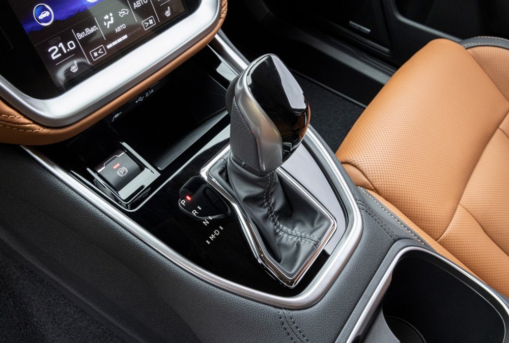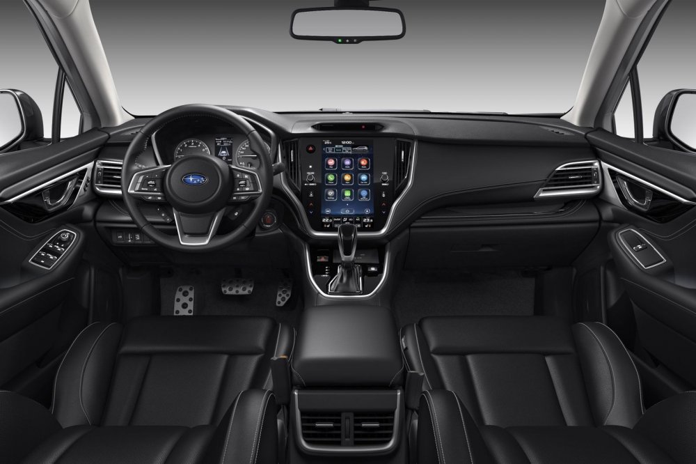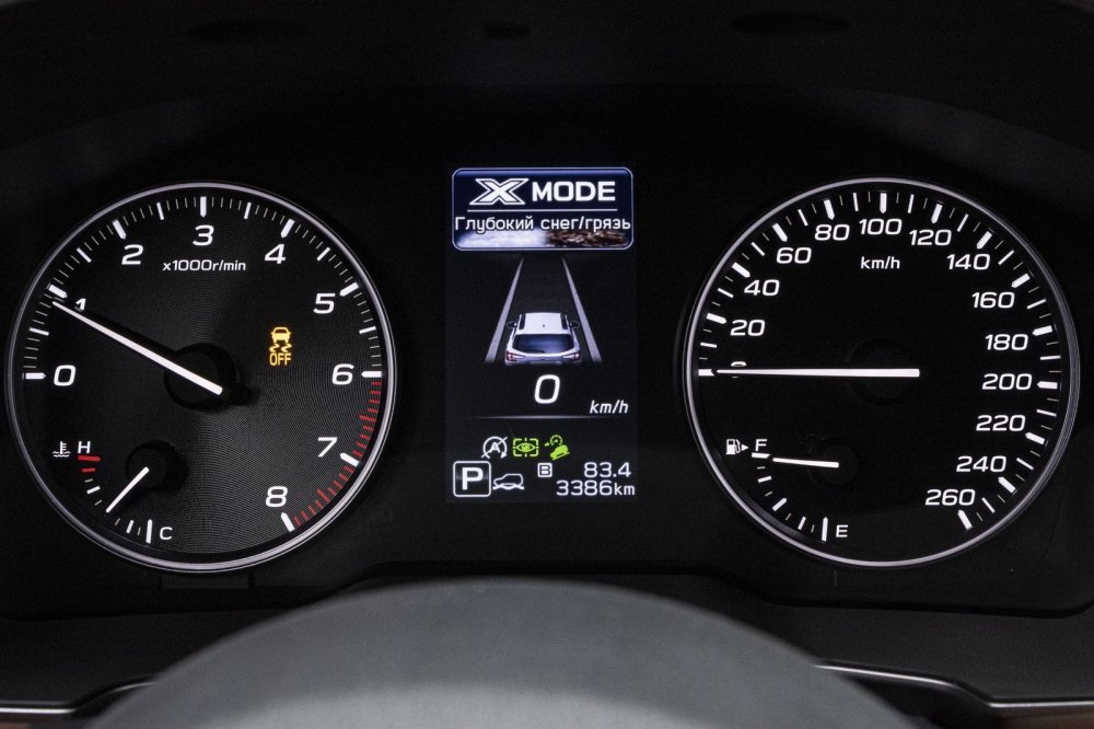 А вот оформление салона претерпело весьма серьезные изменения: тут новая доминанта, 11,6-дюймовый сенсорный дисплей с вертикальной ориентацией, расположенный на центральной консоли. Из отделки полностью исчезли деревянные элементы, зато добавилось деталей из сатинированного алюминия. Панели обтянуты натуральной кожей Nappa (по крайней мере в двух комплектациях из трех возможных). Я, честно говоря, ожидал, что в рамках общих тенденций Subaru использует еще один дисплей вместо приборной панели, но нет. Комбинация имеет вполне традиционный вид и состоит из двух аналоговых приборов и расположенного между ними 4,2-дюймового информационного экранчика. Можно только отметить, что циферблаты тахометра и спидометра лишились отдельных колодцев, и их теперь окружает общая серебристая окантовка, над которой нависает выступ верхней части передней панели в виде козырька.