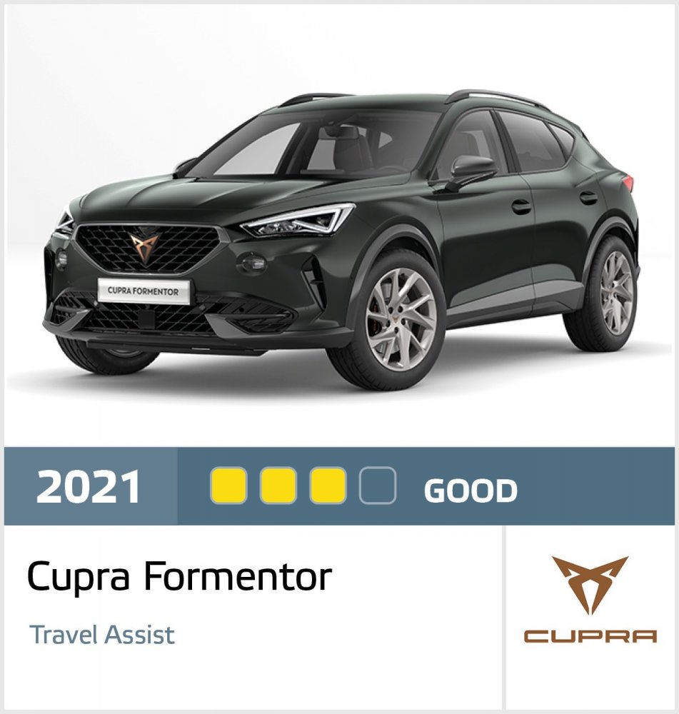 Гибридный кроссовер Cupra Formentor и его вспомогательная система Travel Assist получили «тройку». К недостаткам эксперты отнесли отсутствие проекционного экрана, чтобы показываться статус работы системы непосредственно в поле зрения водителя, отсутствие салонной камеры слежения за водителем и отсутствие помощи при перестроениях. В ряде испытаний Travel Assist поздно реагировал на помеху и приводил к срабатыванию AEB (система автоматического аварийного торможения).