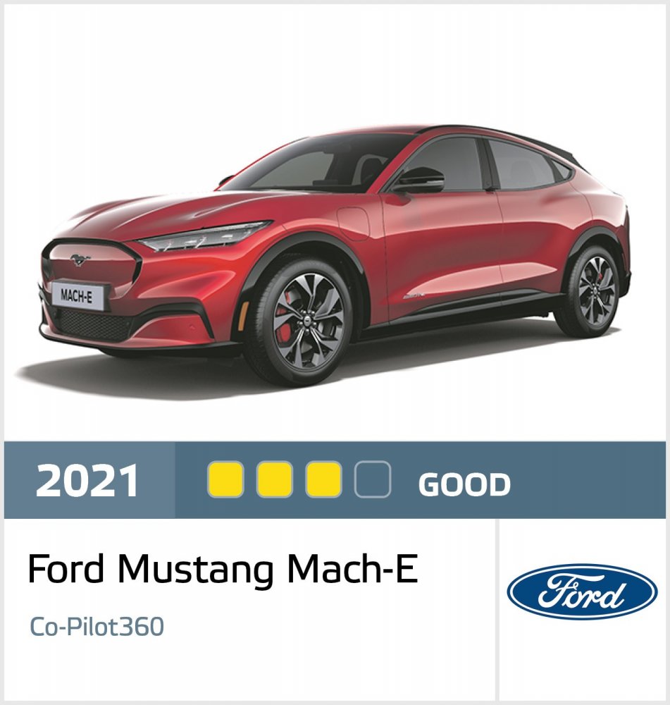 Электрический кроссовер Ford Mustang Mach-E и его система Co-Pilot360 тоже получили «тройку», при этом название Co-Pilot360 экспертам не понравилось — слишком амбициозное, оценка за информирование была снижена. Co-Pilot360 не умеет снижать скорость перед поворотами и перекрёстками, в ряде испытаний провоцирует срабатывание AEB, а удержание в полосе на дуге возможно лишь на самой низкой предусмотренной тестом скорости (80 км/ч). В случае впадения водителя в несознанку система не останавливает автомобиль, а замедляет его в пределах полосы до 10 км/ч.