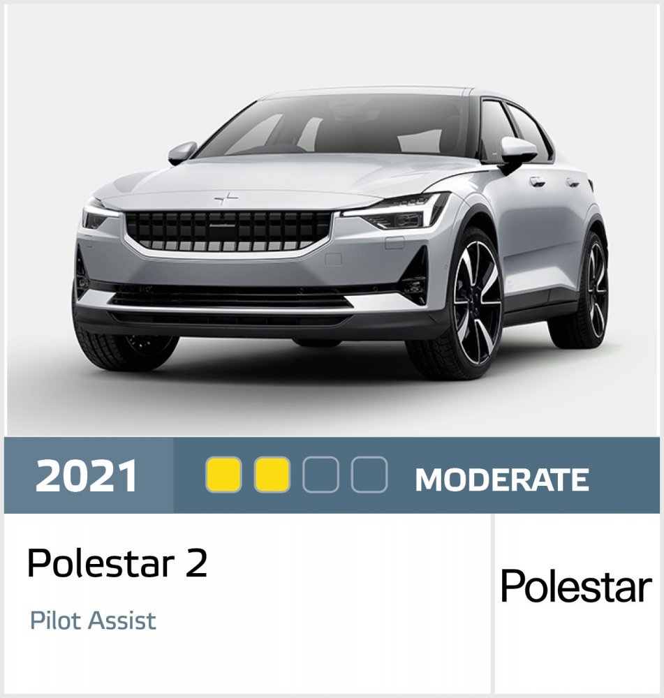 Электрический кросс-лифтбек Polestar 2 и его система Pilot Assist оценены на два балла: слабые адаптивные способности, проблемы с распознаванием статичной помехи, создание аварийной ситуации в одном из тестов на подрезание. Зато если водитель отключится, система сама безопасно остановит автомобиль в пределах полосы.
