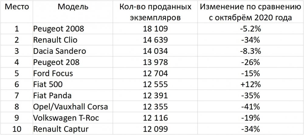 ТОП-10 самых продаваемых моделей в Европе в октябре 2021 года