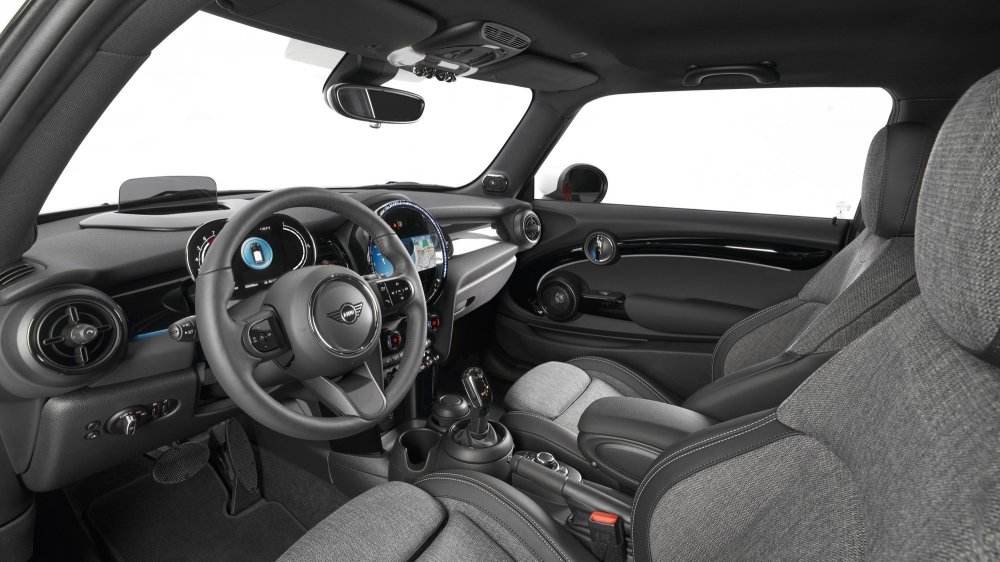 В салоне видим новый руль со смещёнными вниз боковыми спицами и гораздо более лаконичную, чем у «третьего» Mini, переднюю панель без традиционного щитка приборов — есть лишь маленький проекционный экран бюджетного типа, когда проекция идёт не на лобовое стекло, а на выдвижное отдельное стёклышко. Большой чёрный тонкий круг по центру — это, очевидно, новый мультимедийный сенсорный экран, под ними разместился овальный блок с физическими тумблерами. Зеркала заднего вида теперь скорее прямоугольные, чем овальные.
