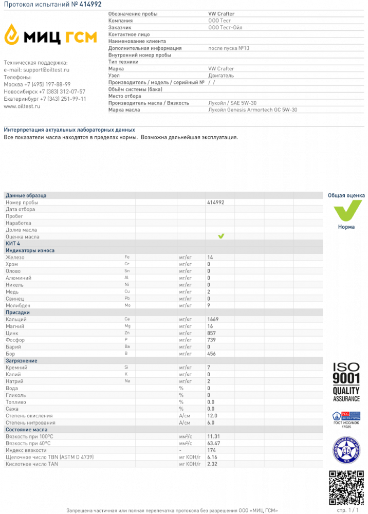 Специалисты МИЦ провели оценку образцов масла LUKOIL GENESIS ARMORTECH GC 5W30 на физико-химическое состояние: кислотное и щелочное числа, РН-кислотность, степень окисления и нитрования, сажу, примесь топлива или антифриза, определили состав и концентрацию продуктов износа.