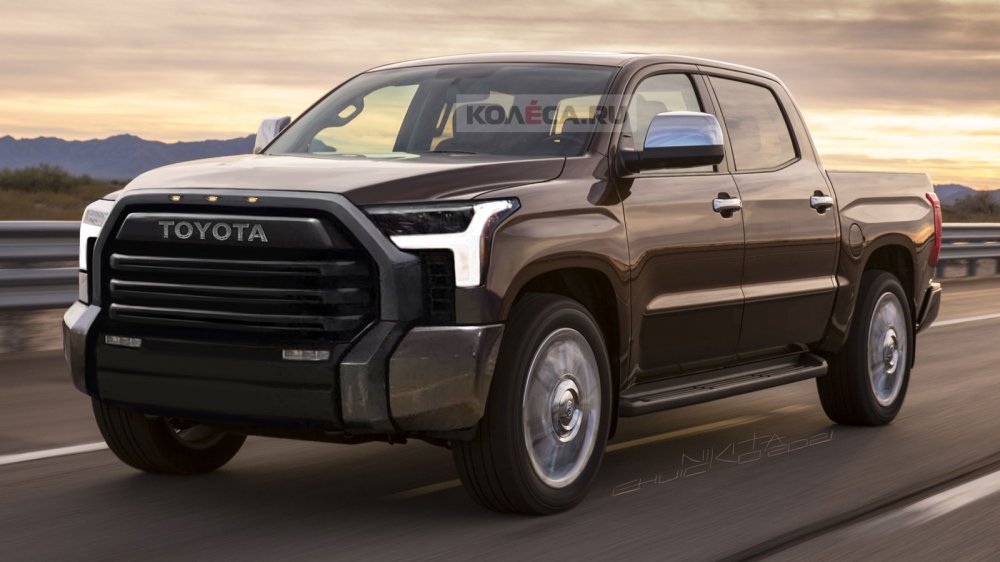 Одна из самых долгожданных новинок – полностью новое поколение пикапа Toyota Tundra, ведь предыдущая модель производилась с 2007 года. В начале лета были сделаны наши рендеры, и серийная модель отличается более угловатой стилистикой кузова, чёрными стойками лобового стекла, массивными декоративными элементами на капоте, формой фонарей, оформлением заднего борта.
