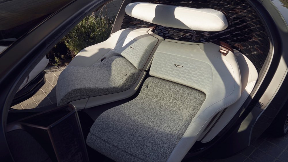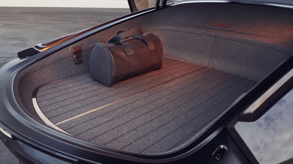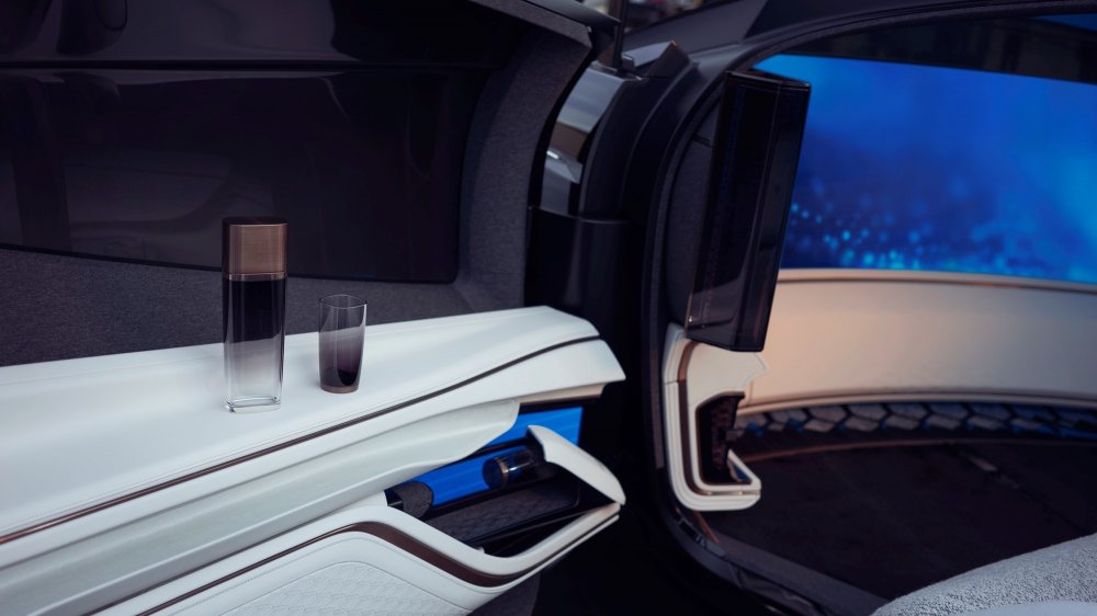 Для удобства входа и выхода половинки дивана слегка поворачиваются в сторону распашных дверей, при этом при открытии дверей часть крыши поднимается вверх, чтобы при посадке не приходилось пригибаться и можно было буквально плюхнуться на мягкие подушки, как на любимый диван у вас дома. Под диваном прячутся выдвижные секции, позволяющие увеличить длину подушек и положить ноги на мягкие подпорки. Под экраном имеется комод с подушками, одеялами и тапочками. В дверные карты встроен бар-холодильник с напитками. Багажник полностью отделён от салона, но при этом также отделан мягкими, приятными на вид и ощупь материалами.