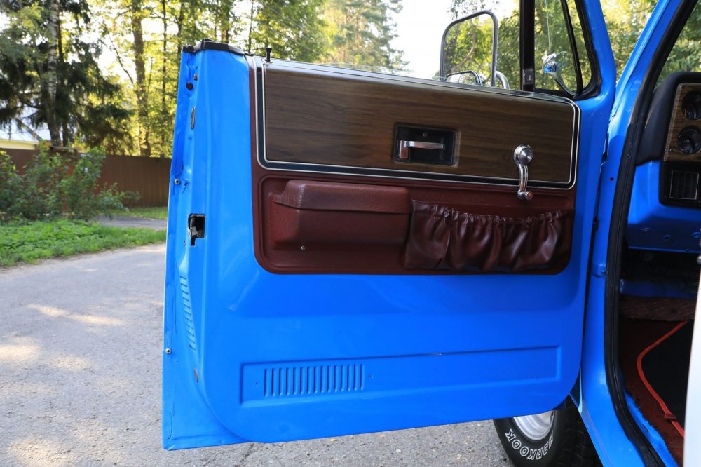 Фирменная фишка всех Blazer K5 второго поколения – стекло задней откидной двери, опускающееся в дверь. Такая конструкция нужна для кузова со съемной жесткой крышей и для кузова кабриолет. Стекло задней двери в этом формате невозможно сделать в виде отдельного элемента, поднимающегося вверх на петлях, ибо сверху его не к чему крепить. Также его нельзя сделать заодно с задней дверью, распахивающейся вбок, поскольку после того, как верх снят, задний борт не должен возвышаться над оконной линией дверей, чтобы не служить «антипарусом». В итоге стекло опускается в заднюю дверь так же, как в боковые, а управляет механизмом опускания раскладная ручка-«мясорубка», установленная снаружи:
