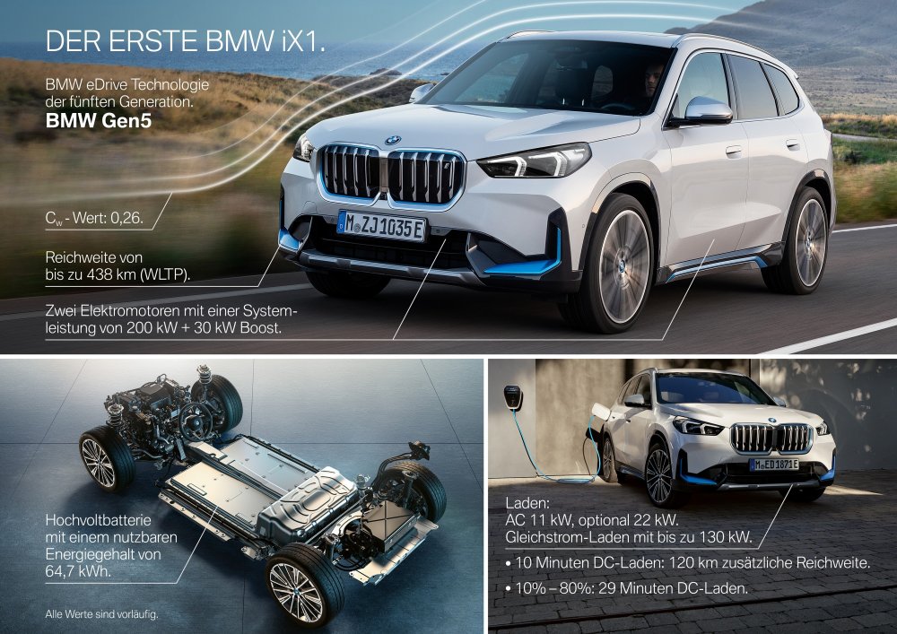 В одном из слайдов перечислены основные характеристики электрического BMW iX1: ёмкость интегрированной в пол батареи — 64,7 кВт·ч, её полного заряда хватит на 438 км по циклу WLTP, максимальная мощность зарядки — 130 кВт (она позволяет пополнить заряд с 10 до 80% за полчаса). Силовая установка состоит из двух электромоторов (по одному на каждую ось), их совокупная пиковая мощностью — 230 кВт (313 л.с.), постоянная — 200 кВт (272 л.с.).