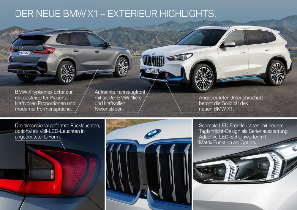 В целом же BMW X1 сохранил узнаваемый облик предшественника, но стал чуть более угловатым, фирменные ноздри увеличились в размерах и «оквадратились», боковины стали более плоскими (у прежнего Х1 было характерное ребро ниже подоконной линии), удобные дверные ручки под естественных уступили место старомодным «утопленным», заставляющим выворачивать ладонь, значительно усложнилась форма заднего бампера — он теперь щеголяет большой глянцевой вставкой.