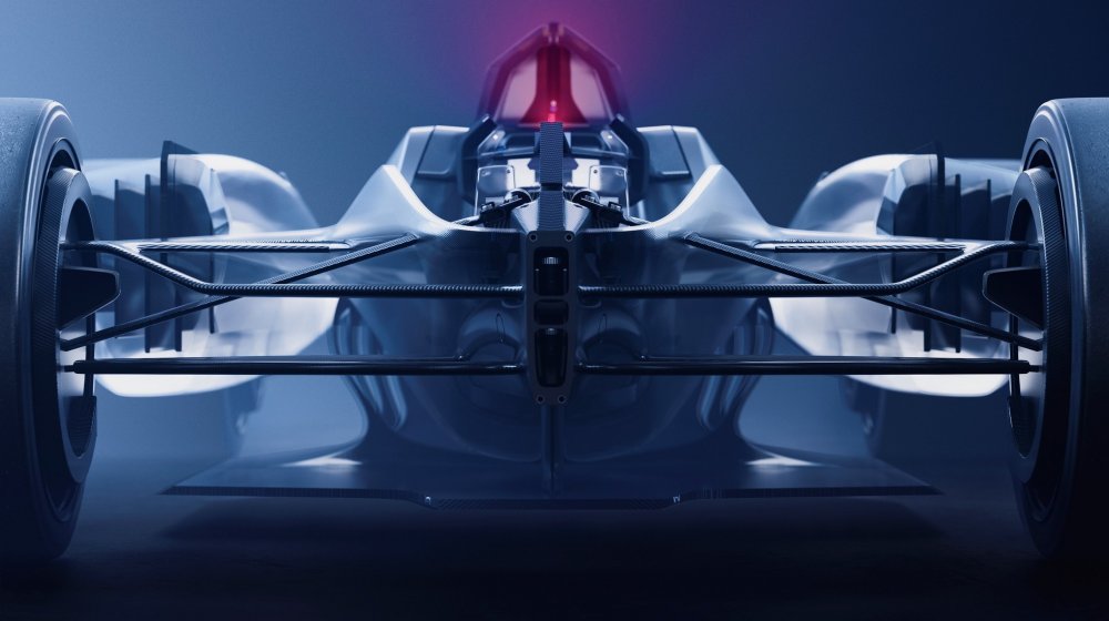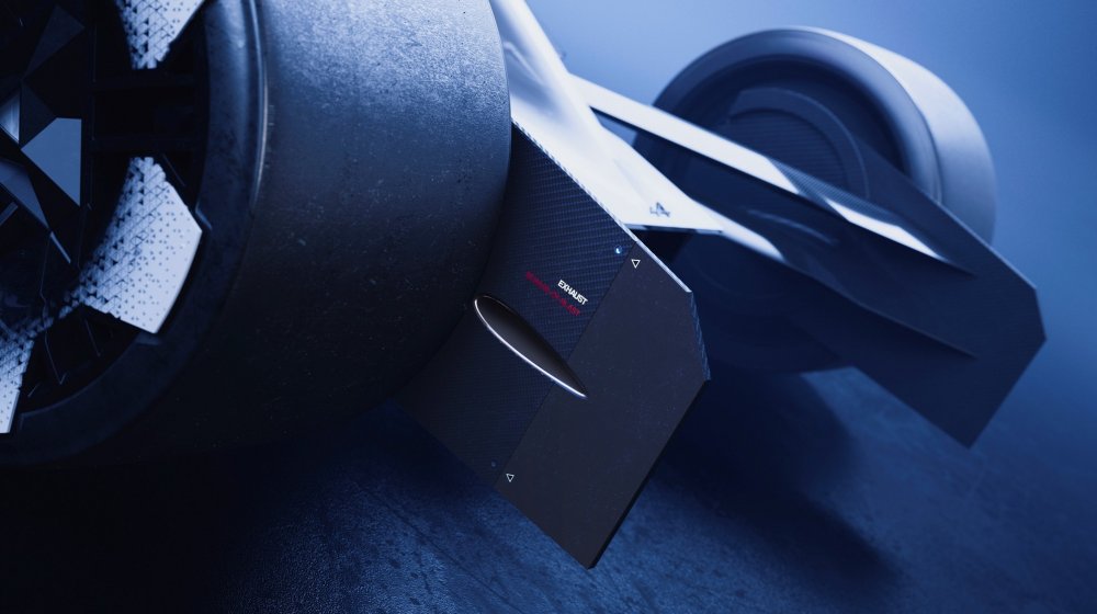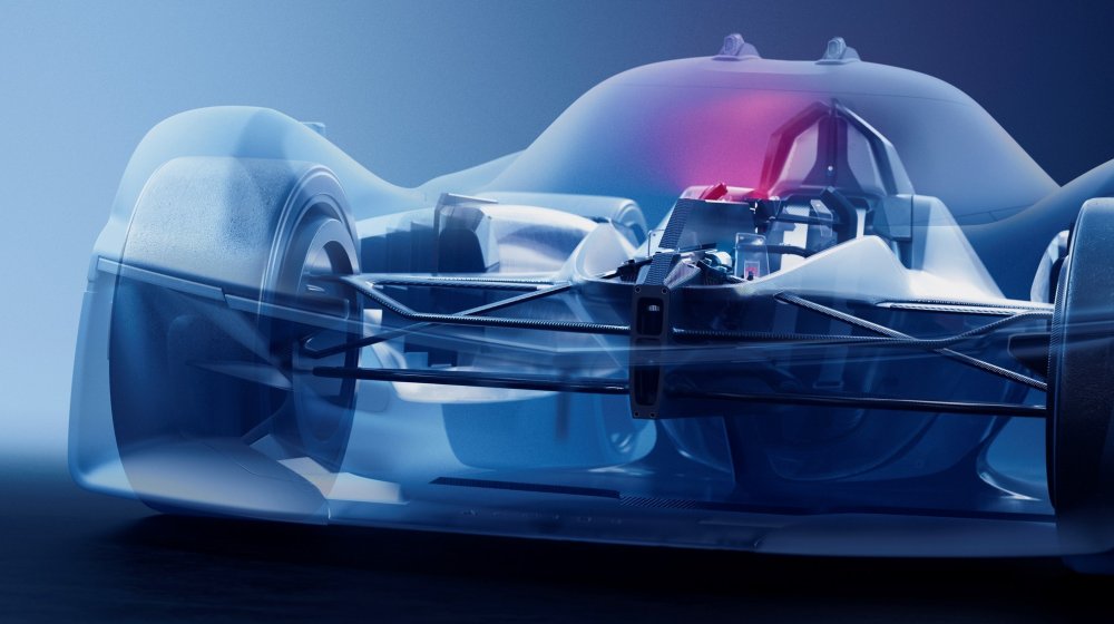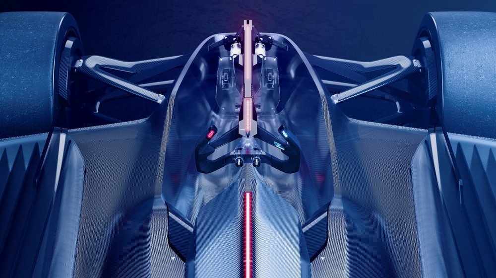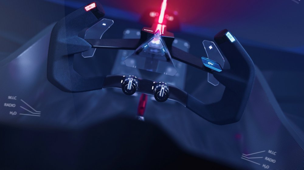 В минималистичном кокпите тоже многие элементы выполнены из прозрачного материала — например, педали и лепестки на руле. Сам руль — многофункциональный, он напоминает штурвал гоночных прототипов класса LMP1, светящаяся пирамида в центре — это ключ, который нужно вставить в руль перед запуском силовой установки.
