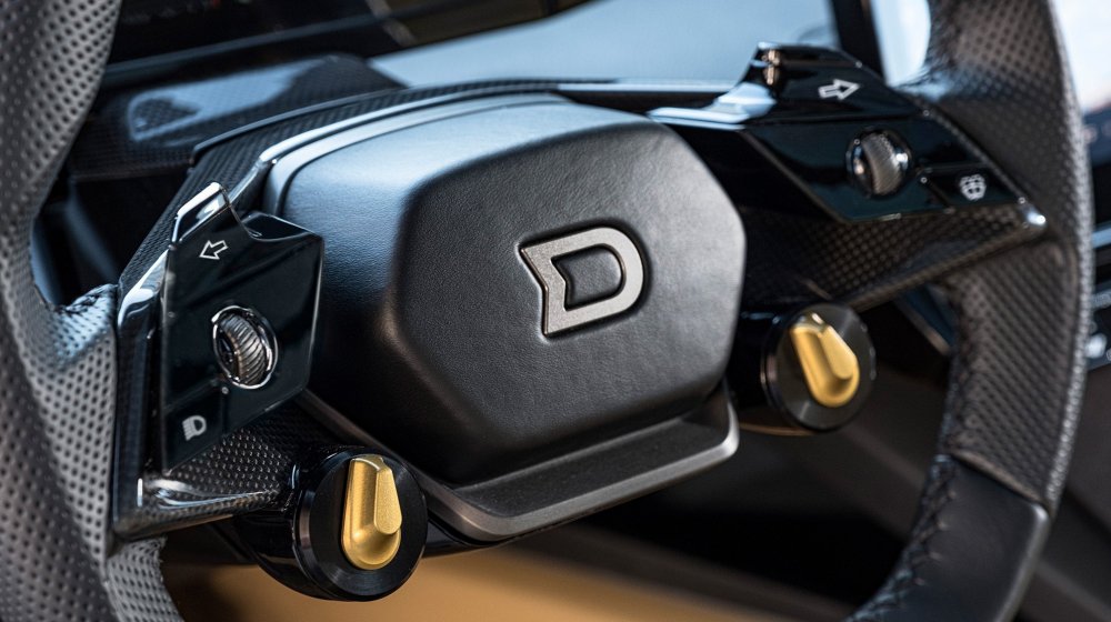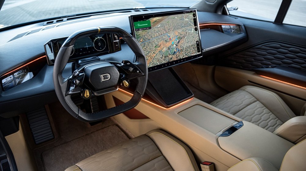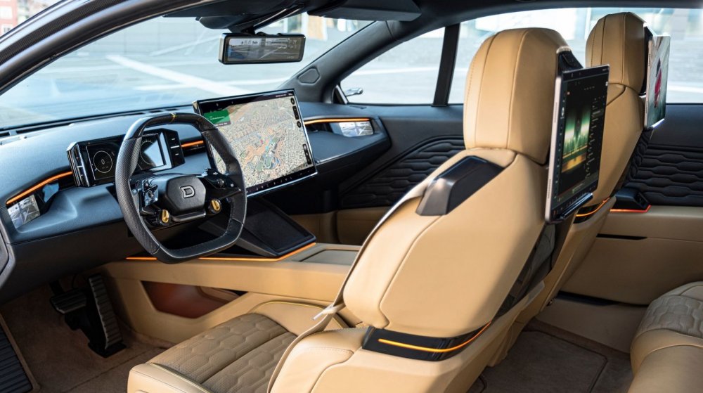 Салон — типичный для современных кроссоверов, но отделка и деталировка не производят впечатления «гипер-лакшери», скорее обычный премиум американского розлива, то есть не самый утончённый. Лаконичная передняя панель сконфигурирована под установку боковых экранов, заменяющих наружные зеркала, но компания готова всё же предложить и обычные зеркала вместо экранов (что будет в таком случае на месте боковых экранов, непонятно). Центр передней панели занимает 17,1-дюймовый мультимедийный сенсорный экран с операционной системой Drako DriveOS, куда «зашиты» все ключевые настройки автомобиля, физических кнопок на передней панели нет. Рамка мультимедийного экрана толстая и глянцевая, словно у недорого компьютерного монитора, а вот многофункциональный руль очень изящный и напоминает таковой у кроссовера Lotus Eletre.