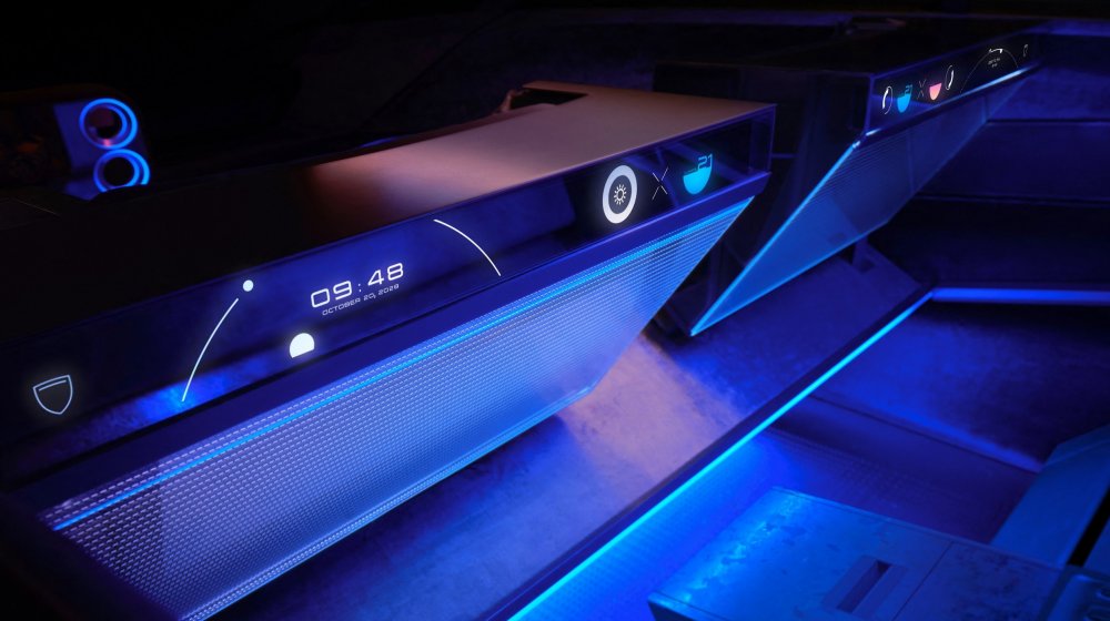 Декорирован салон в стиле клубов 70-х — просторные кубические кресла снабжены массивными стёганными подголовниками, голый оцинкованный метал с перламутровым блеском сочетается с зеркальными поверхностями и обивкой из переработанного полиэстера. В периметр салона органично инсталлирована аудиосистема Focal с двумя сабвуферами в полу — атмосфера дискотеки во время езды гарантирована.