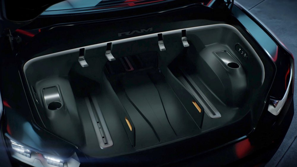Задняя стенка кабины складная, благодаря ей груз из кузова может частично заходить в кабину. Распашные створки заднего борта и выдвижная панель пола также позволяют увеличить длину грузовой площадки. Вдобавок спереди имеется объёмный багажник-органайзер с глубоким центральным тоннелем. Если всё это будет реализовано в серийном пикапе, то по части практичности Ram 1500 BEV заткнёт за пояс конкурентов.