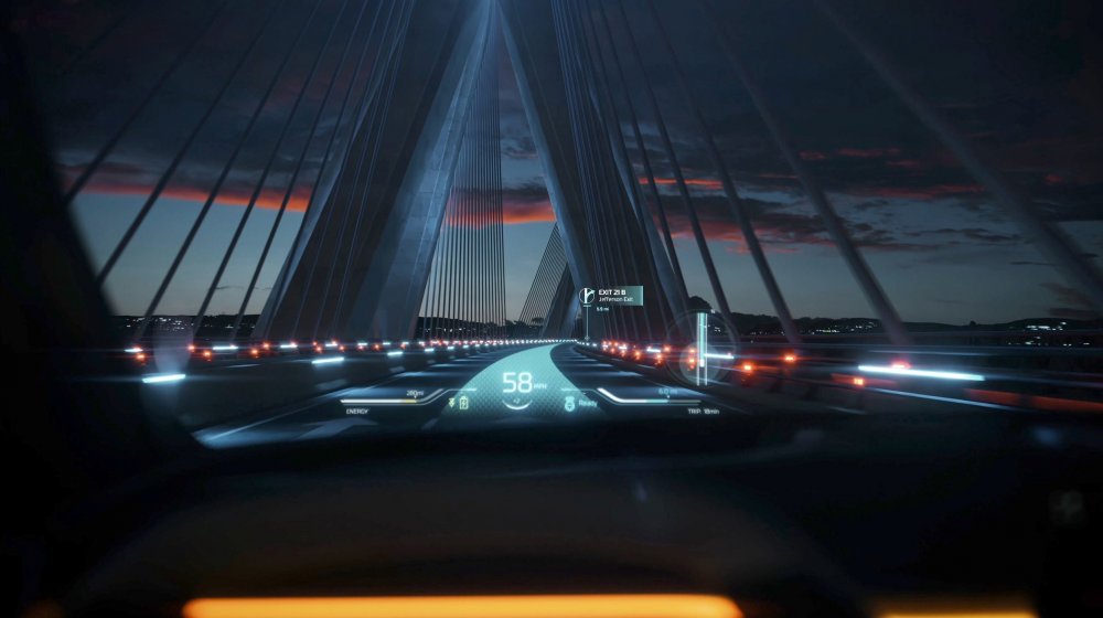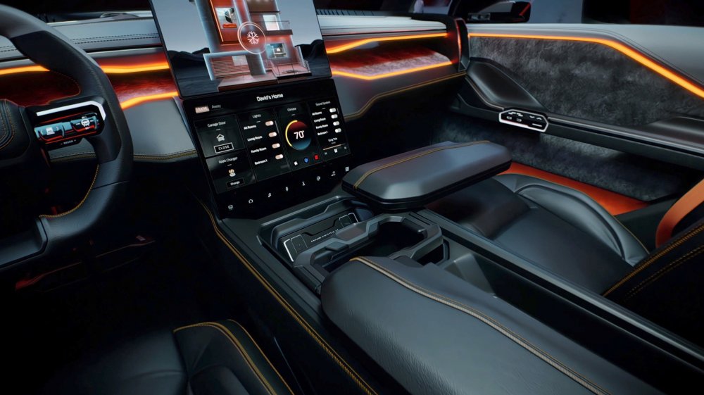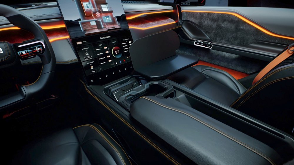 В салоне светодиодная подсветка на передней панели воспроизводит форму камертонов. Щитка приборов нет, его заменяет проекционный экран. Второй проектор установлен снаружи кузова и позволяет смотреть фильмы, как в уличном кинотеатре. Центральный мультимедийный экран состоит из двух 14,2-дюймовых частей: положение верхней половинки можно регулировать, а нижний экран можно вообще снять и использовать где угодно в кабине для игр или снаружи машины для управления вспомогательными системами. Подлокотники между передними креслами тоже съёмные, их можно установить поверх колен и разложить в столик для работы или перекуса.
